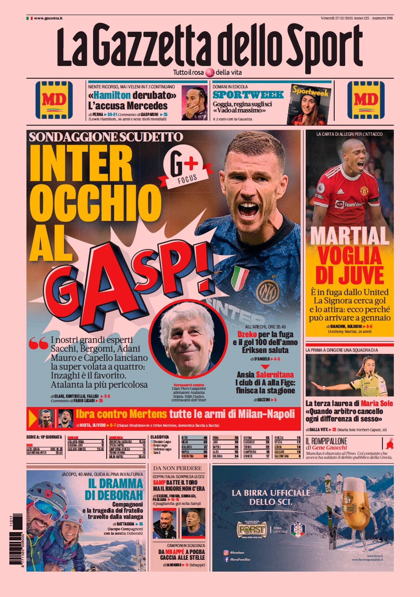 Главный материал Gazzetta посвящён борьбе за Скудетто: «Интер», внимание на Гаспа». Издание опросило экспертов – Сакки, Бергоми, Адани, Мауро и Капелло – которые выдали вердикт: «Индзаги – фаворит, «Аталанта» наиболее опасна».
