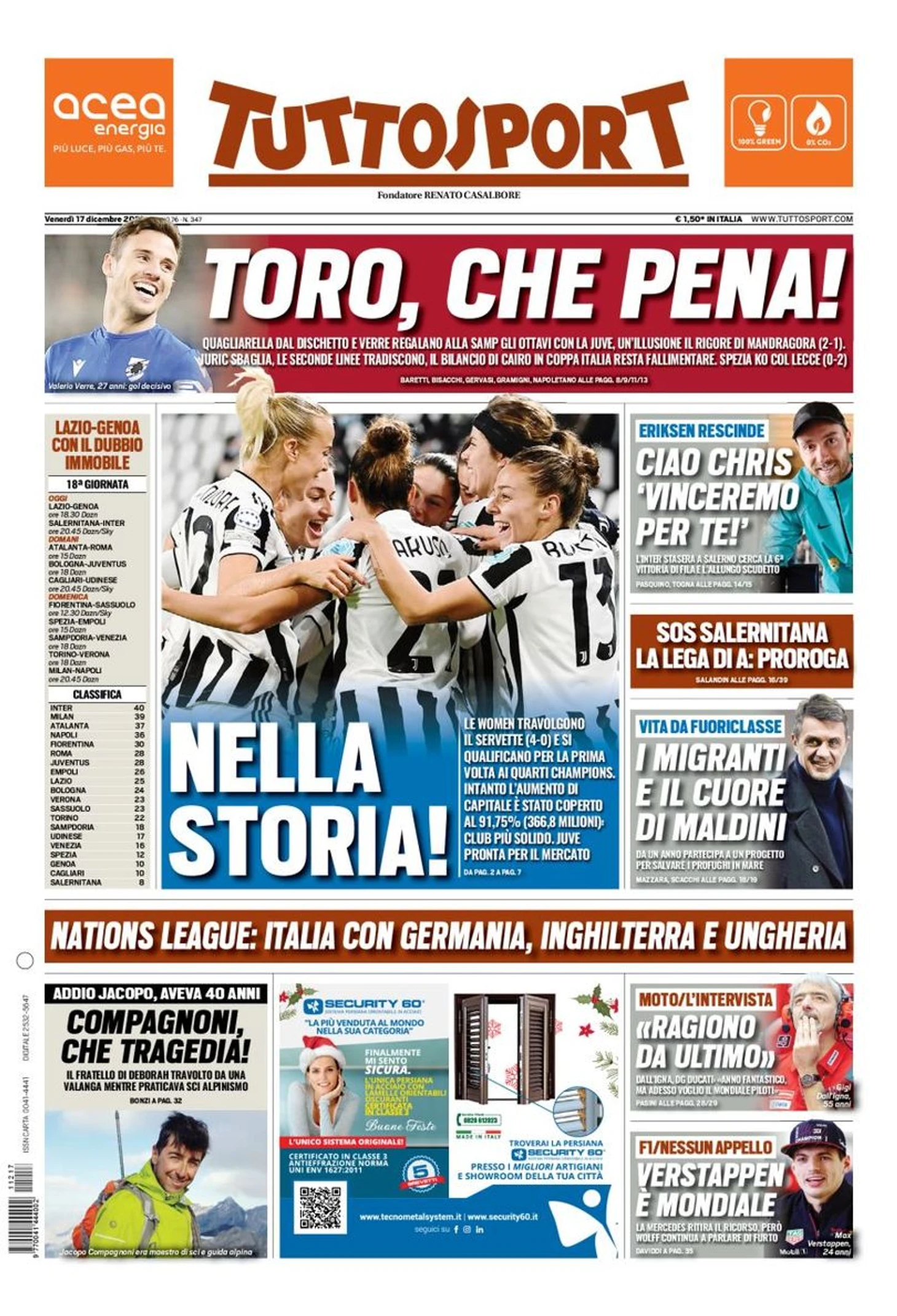 «В истории!» – другой заголовок туринского издания, посвящённому победе женского «Ювентуса». «Разгромлен «Серветт» (4:0) и в первый раз квалифицировались в четвертьфинал Лиги Чемпионов». Уделено внимание и делам «большого «Юве»: «Повышение капитала было покрыто на 91,75% (366,8 миллионов): клуб более уверен, «Юве» готов к трансферам».