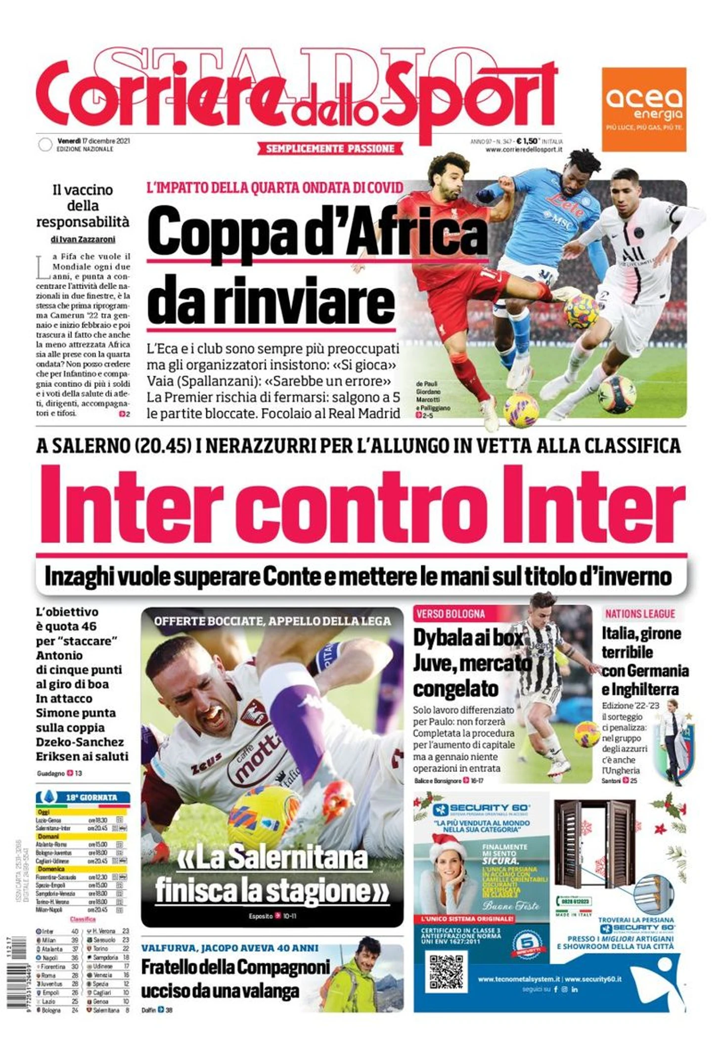 «Интер» против «Интера» – таким заголовком Corriere предваряет сегодняшний матч Нерадзурри против «Салернитаны». «В Салерно (20,45 CET) Нерадзурри для отрыва на вершине таблицы. Индзаги хочет обойти Конте и тянет руки к титулу зимнего чемпиона. Цель – отметка в 46, чтобы «оторваться» от Антонио на пять очков в поворотный момент. Симоне ставит на пару Джеко-Санчес. Эриксен прощается».