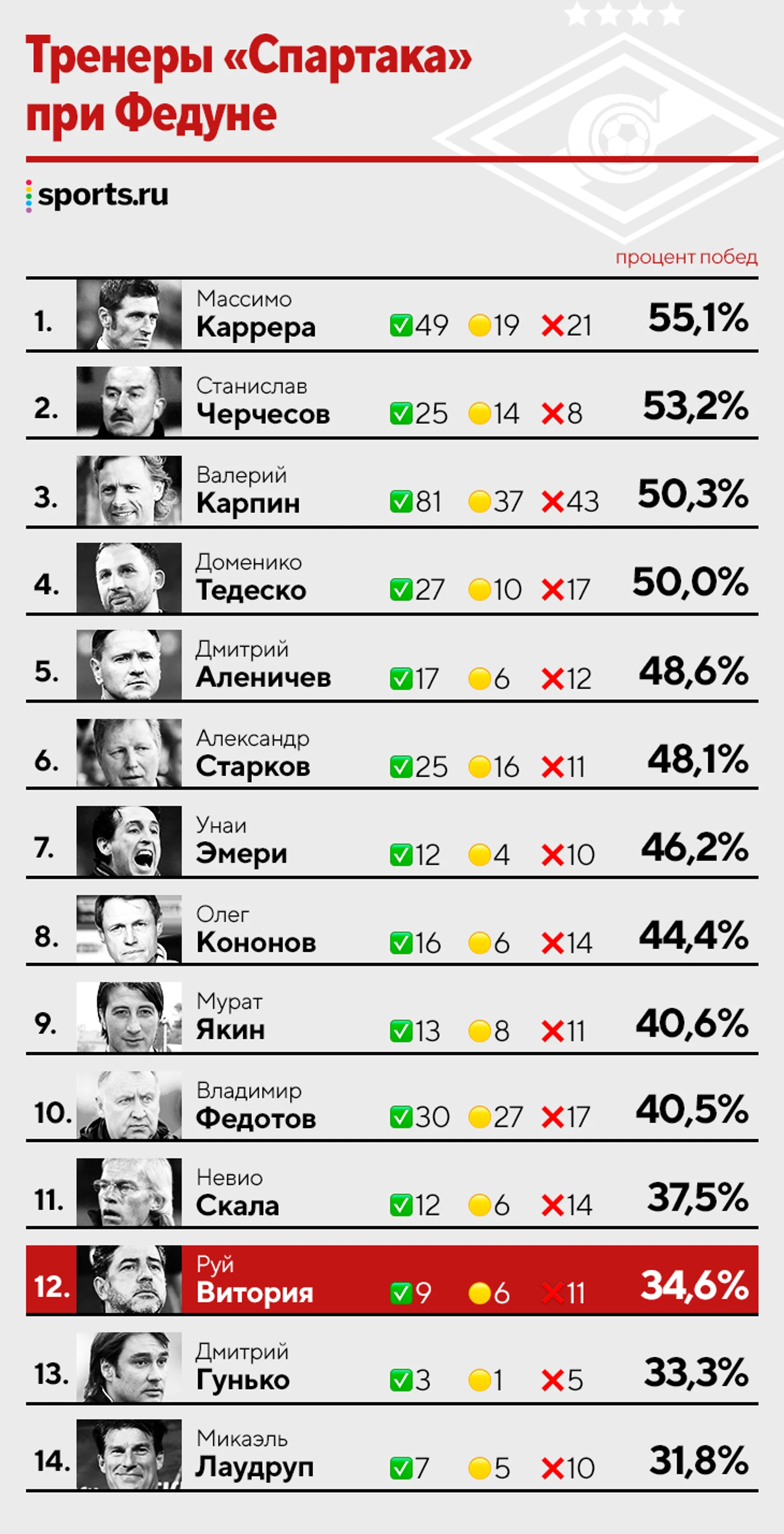 Давайте взглянем на эту таблицу (спасибо Sports.ru). Ох, Витория находится на 12 месте из 14 (я бы сказал на 12 из 13, так как Гунько не задержался бы в клубе при любом раскладе, он был и.о. главного тренера). Хуже только Лаудруп, выставлявший 18-летних пацанов на матчи "Кубка УЕФА" в старте. Я уж не буду вспоминать про такое исторические событие во время работы Витории, как слив "Зениту" 7-1. Самое крупное поражение "Спартака" за время игры в РПЛ и Чемпионате СССР. И вы реально стоите за этого тренера?