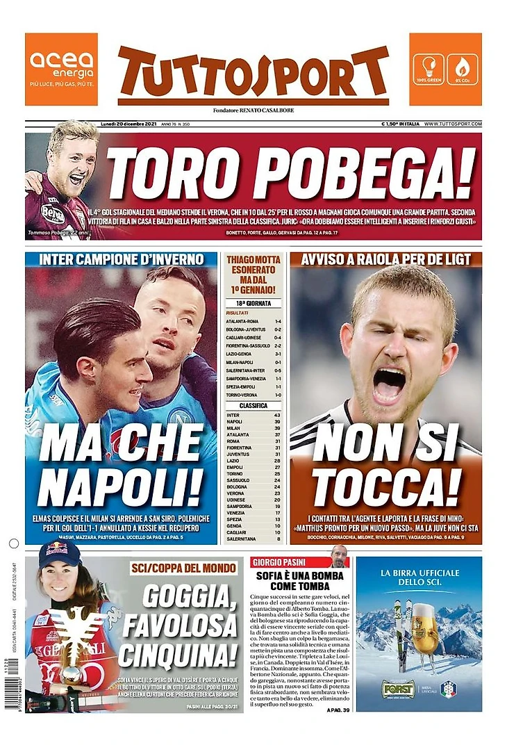Победа «Наполи» над «Миланом», успех «Торино» благодаря голу Побега, а также досрочное зимнее чемпионство «Интера» – в утреннем обзоре заголовков итальянских спортивных изданий в блоге «В гостях у Кальчо».
