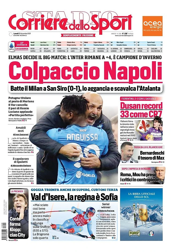 Удача «Наполи». Заголовки Gazzetta, TuttoSport и Corriere за 20 декабря