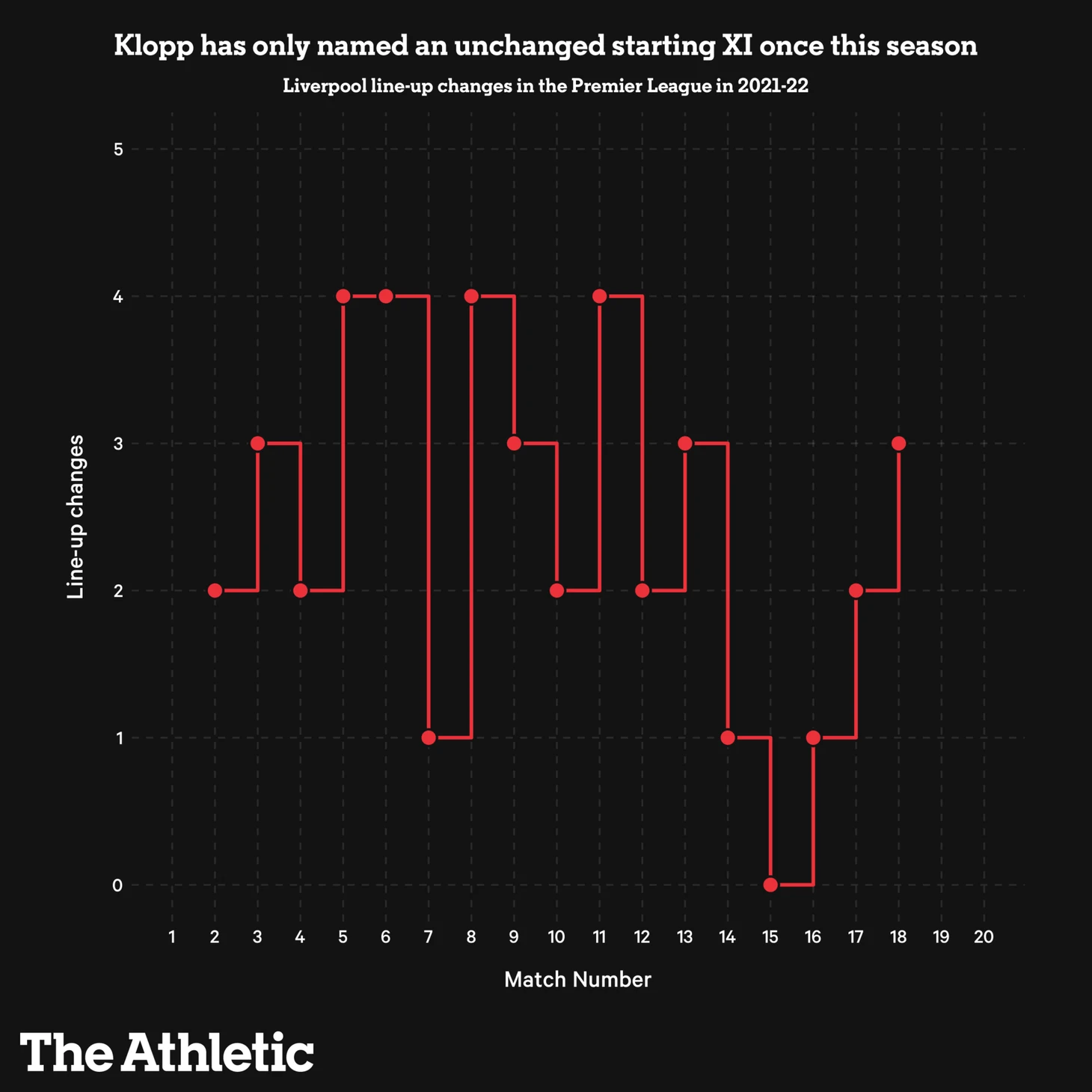 С этого момента и до тех пор предстоит много борьбы с пожарами, но, по крайней мере, Клопп привык менять свой стартовый состав — приведенная ниже диаграмма показывает, что в этом сезоне он выбирал неизменный состав только лишь раз.