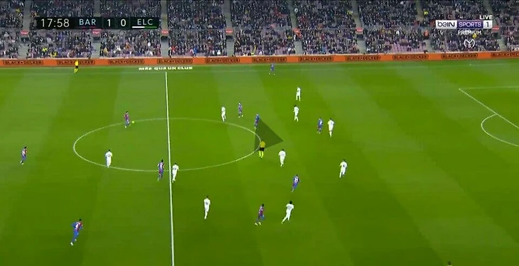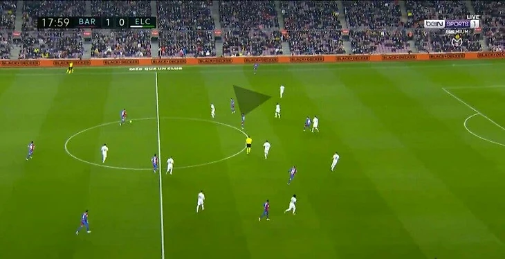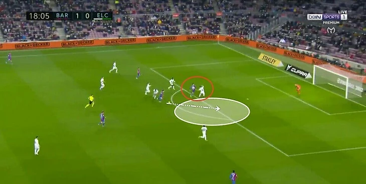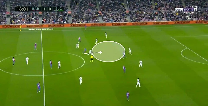 1. Мяч с одного фланга переводится на другой. Гави видит разрыв между игроками «Эльче» и открывается в свободное пространство: