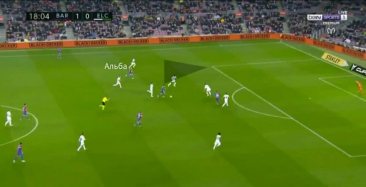 Значит, вариант паса на Альбу — плохой. Он смотрит вперёд и видит выдёргивание центрального защитника соперника. В зону за спиной этого центрального защитника набегает Жутгла, одновременно уводя за собой соперника и открывая пространство для Гави. Гави мог отдать передачу на ход на Жутгла, но: