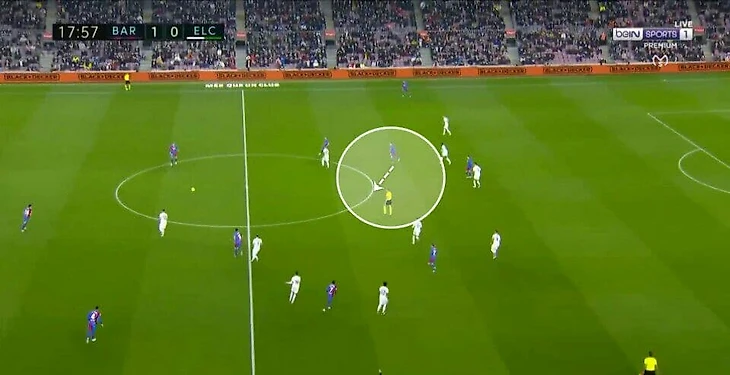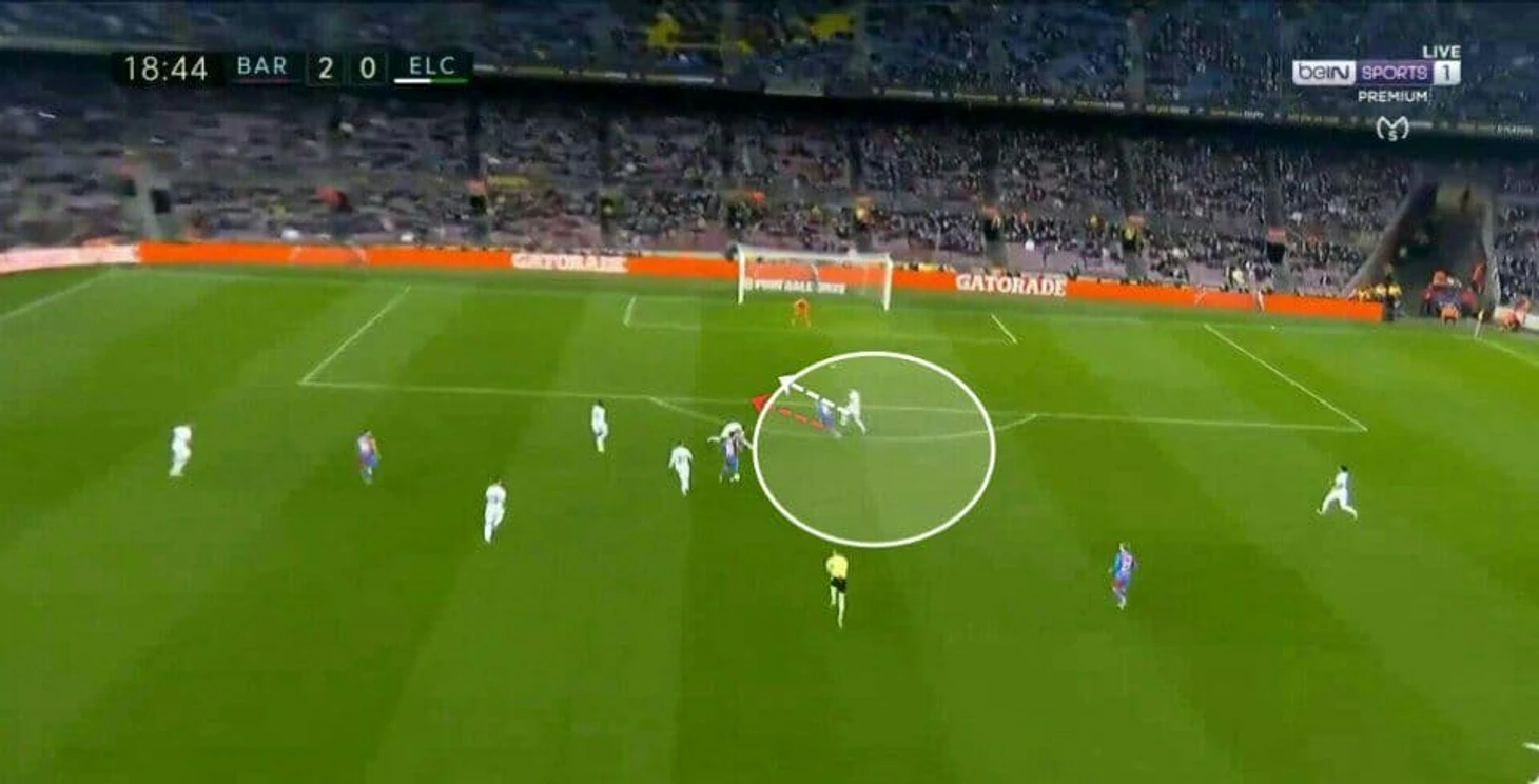 5. Дальше очень важно было принять верное решение. Это требует высокого интеллекта. И Гави принял самое лучшее из решений в этой ситуации. Смотрите: он поворачивает голову (сканирует) налево и видит — там Альба не в самой лучшей позиции — он не готов принять пас, и его окружают игроки «Эльче».