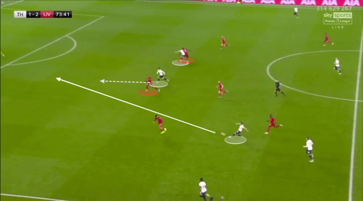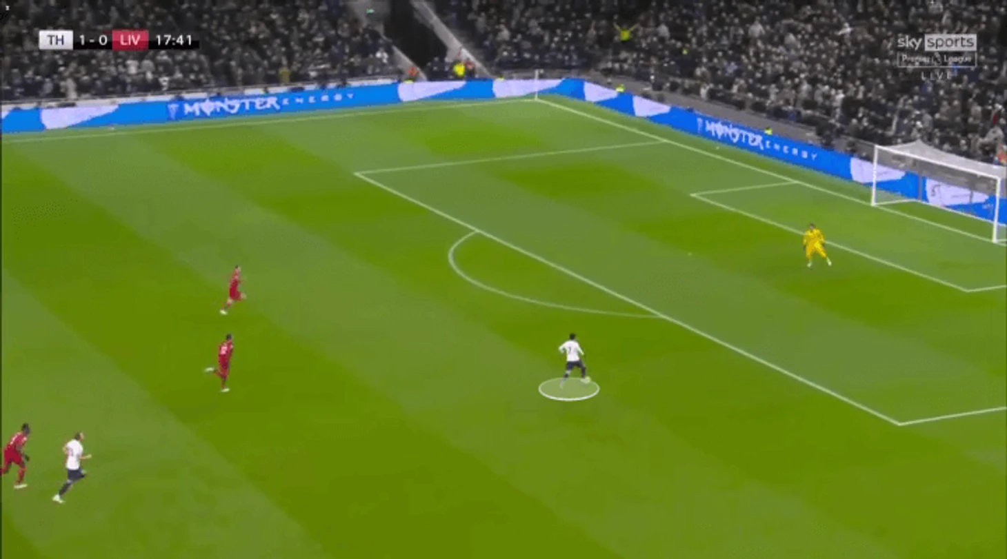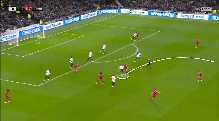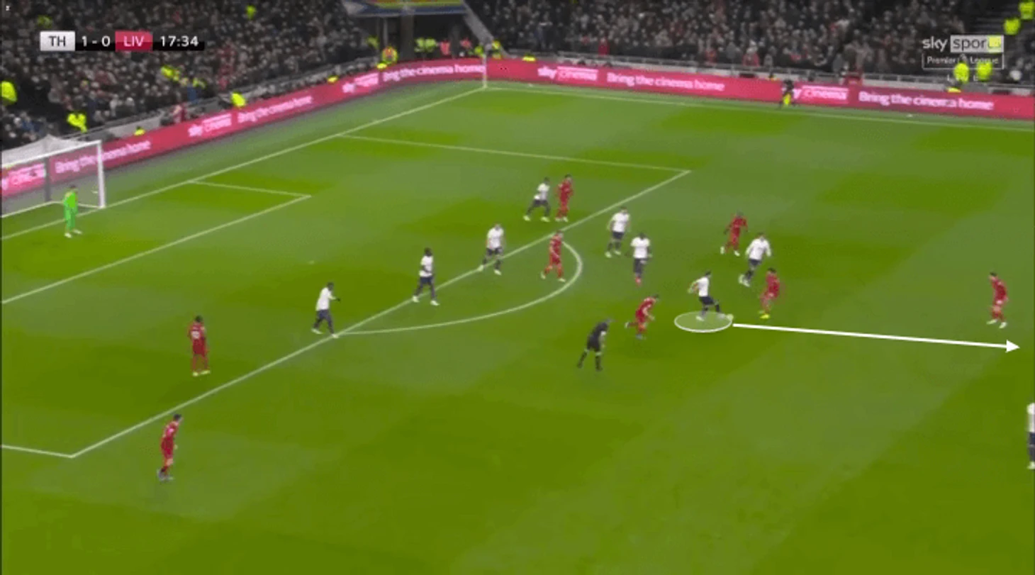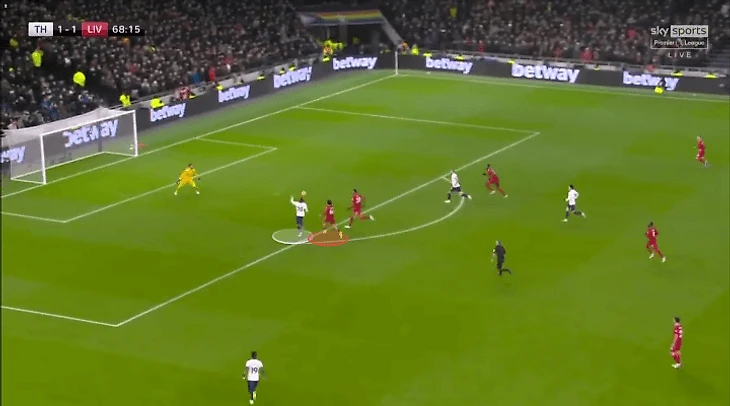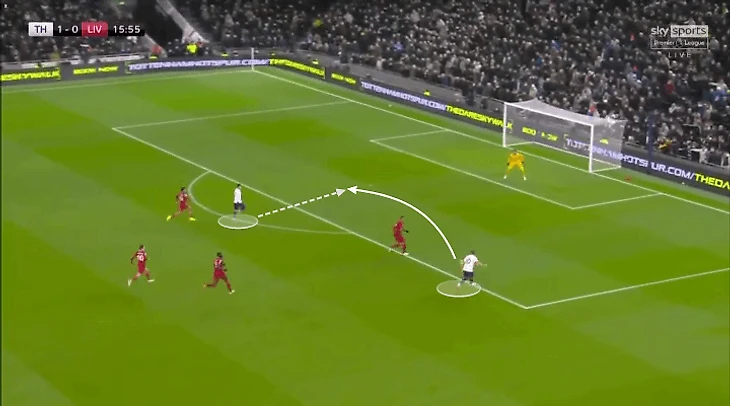 Он дважды получал мяч за спины защитников во втором тайме, сначала после диагонального паса Дайера — обратите внимание, как центральные защитники «Ливерпуля» наблюдают за нападающими Шпор, а Александер-Арнолд не отслеживает его забег. Пас Деле в ноги Кейну корявый и затрудняет завершение атаки.