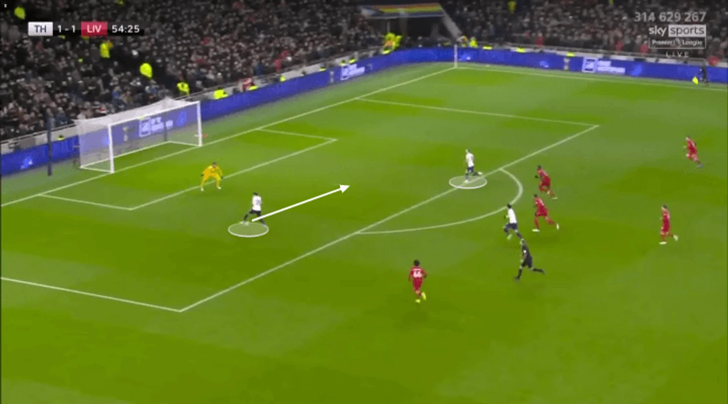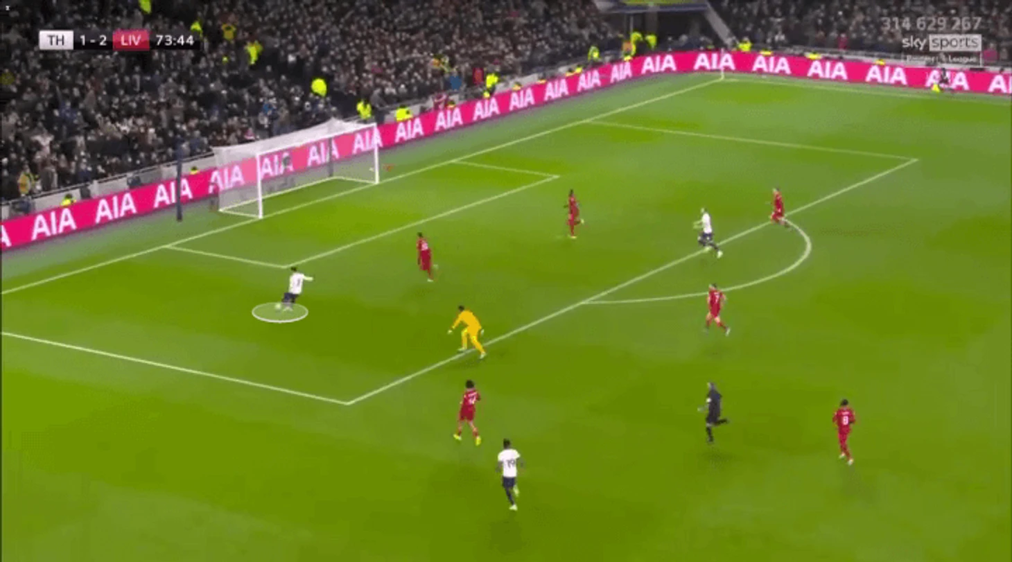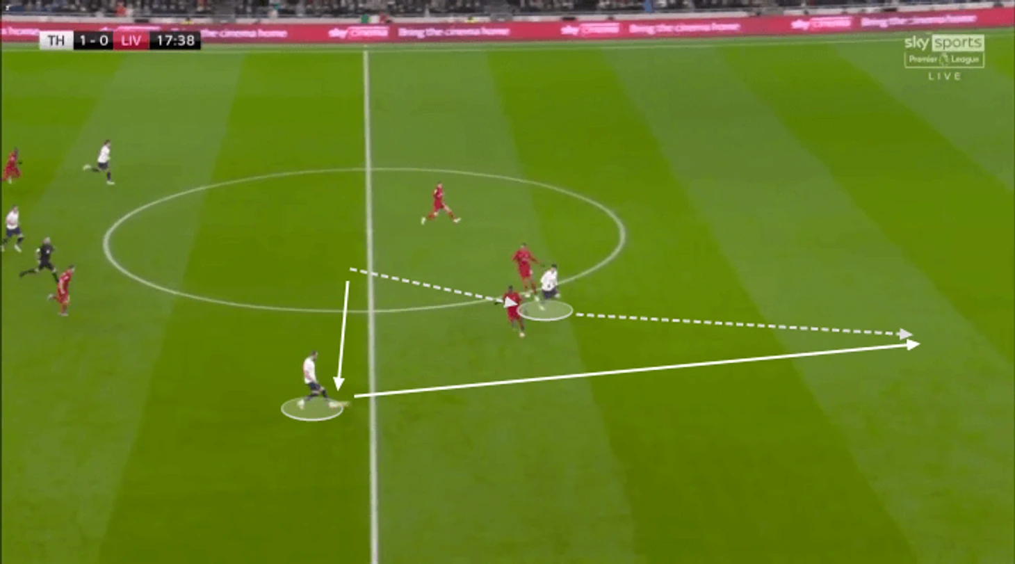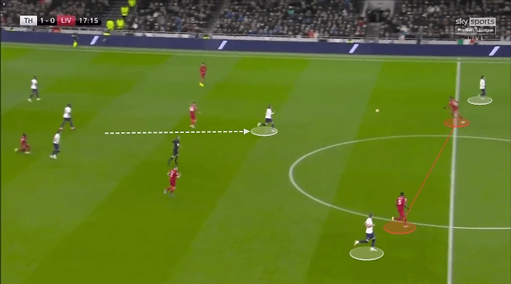 Он дважды получал мяч за спины защитников во втором тайме, сначала после диагонального паса Дайера — обратите внимание, как центральные защитники «Ливерпуля» наблюдают за нападающими Шпор, а Александер-Арнолд не отслеживает его забег. Пас Деле в ноги Кейну корявый и затрудняет завершение атаки.