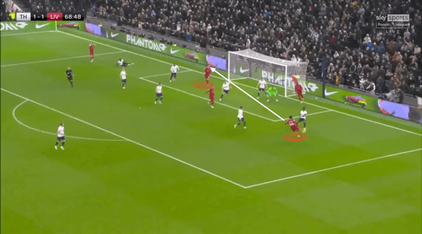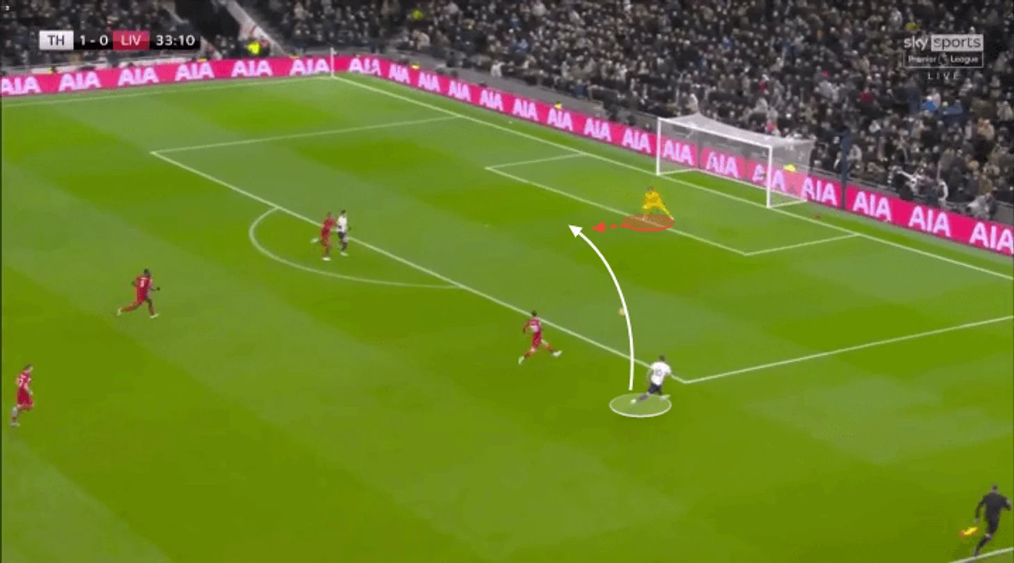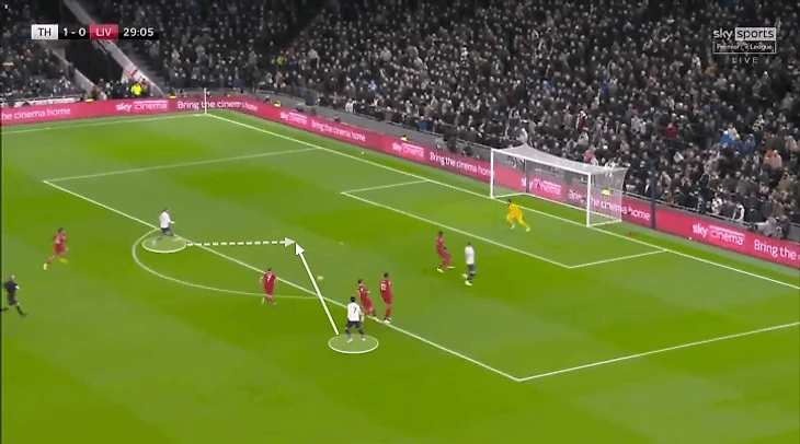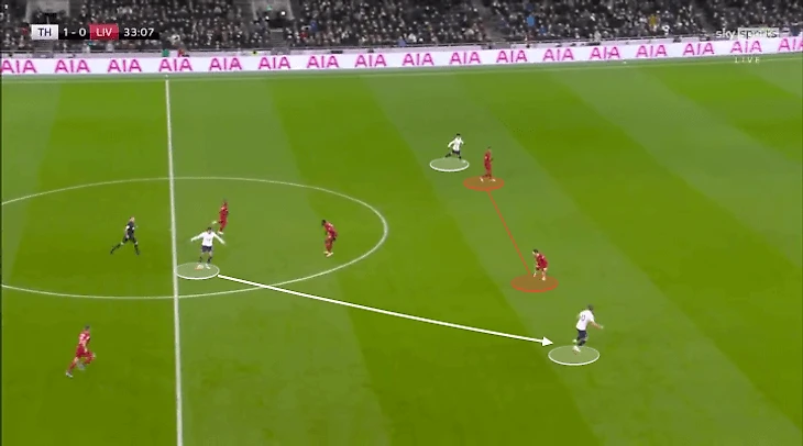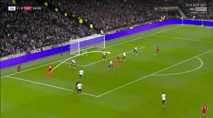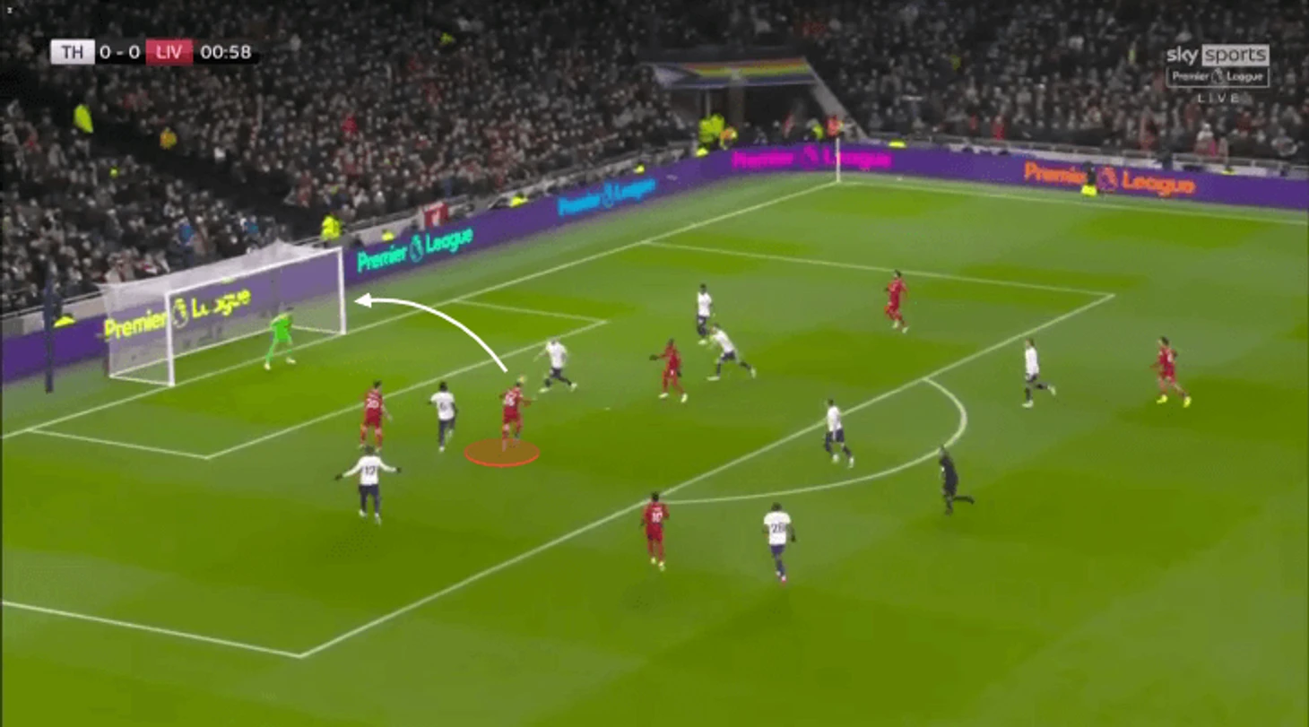 Он дважды получал мяч за спины защитников во втором тайме, сначала после диагонального паса Дайера — обратите внимание, как центральные защитники «Ливерпуля» наблюдают за нападающими Шпор, а Александер-Арнолд не отслеживает его забег. Пас Деле в ноги Кейну корявый и затрудняет завершение атаки.