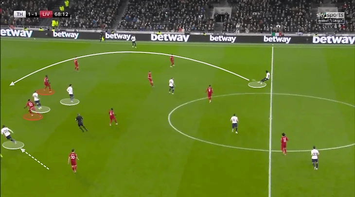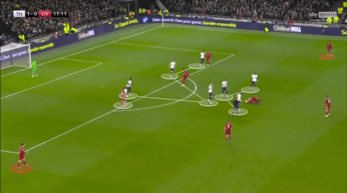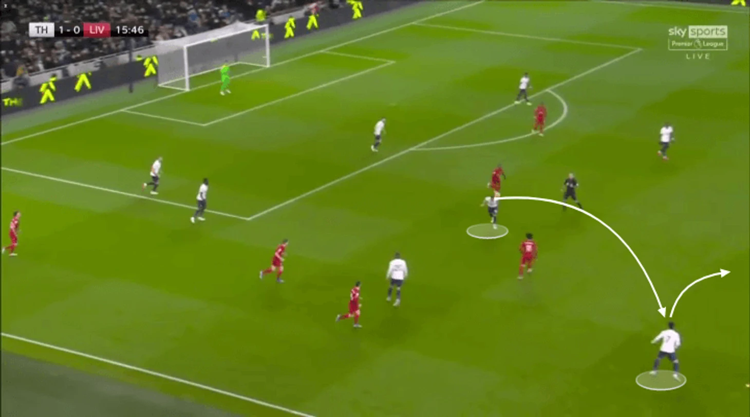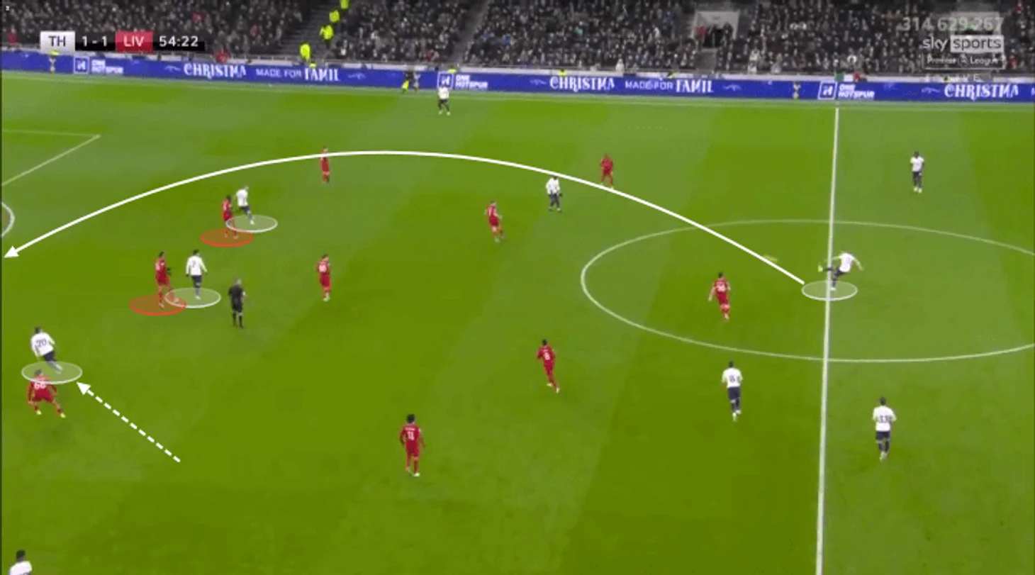 Но тот факт, что Робертсон и Александер-Арнолд продвигались вперед, означал, что при потере мяча, если Шпоры быстро продвигали мяч вперед, они могли бы извлечь выгоду из высокой позиции Харри Кейна и Сон Хын Мина и выбегать два в два. У Жоэля Матипа и Ибраима Конате были проблемы с тем, чтобы справляться с пространством в коридорах.
