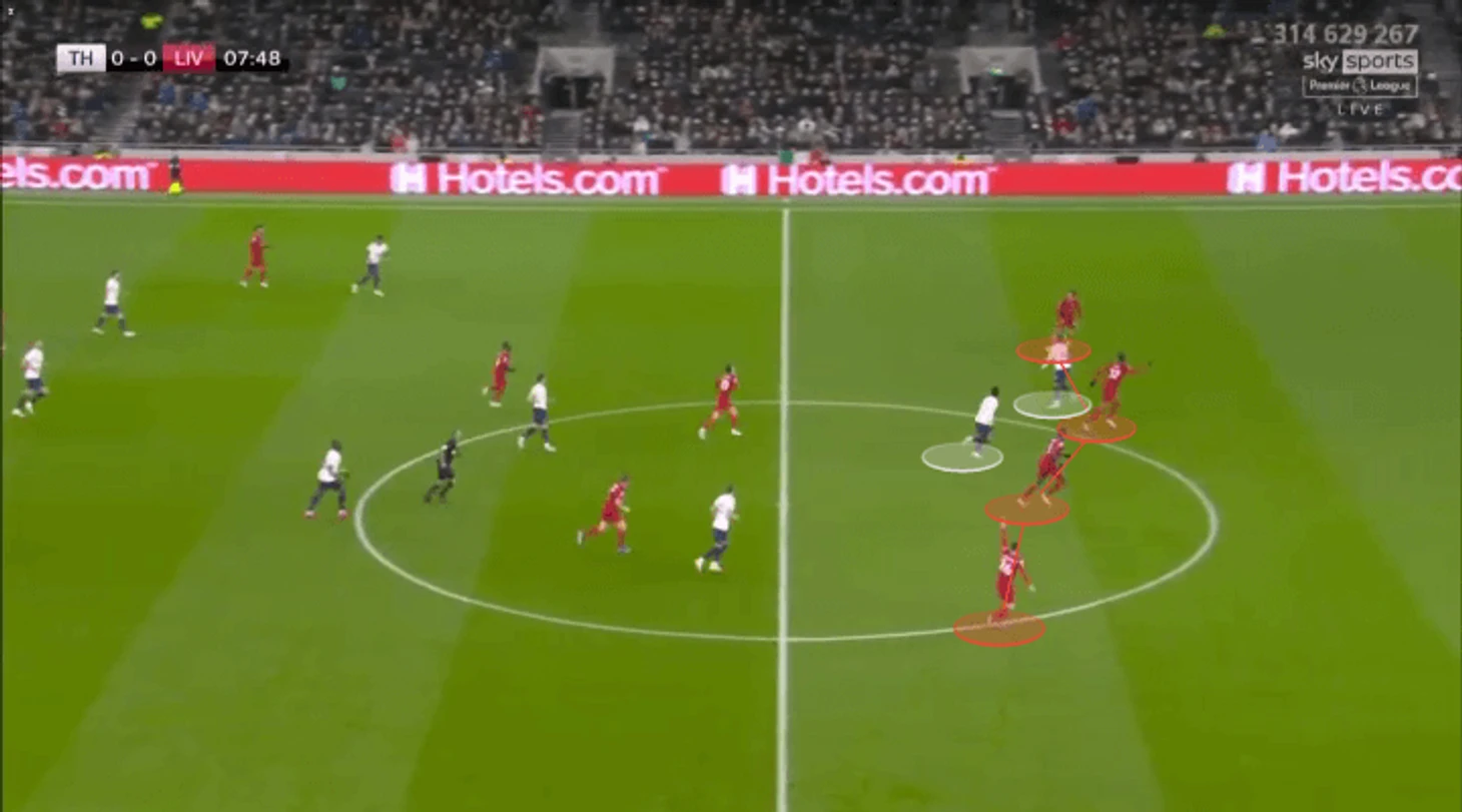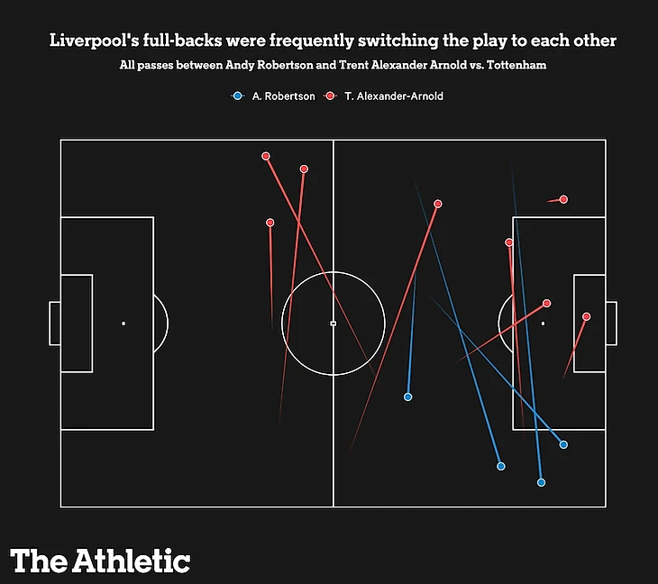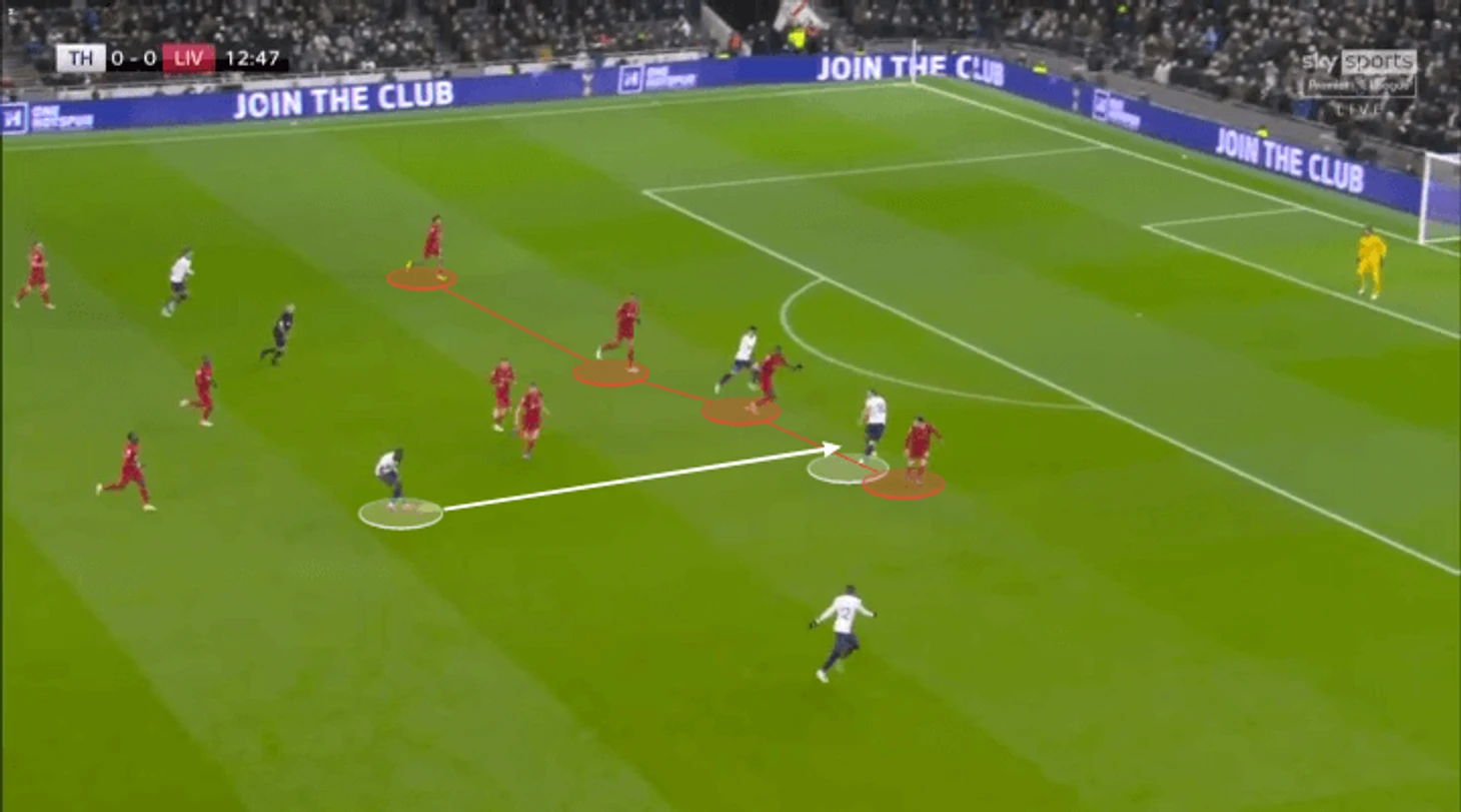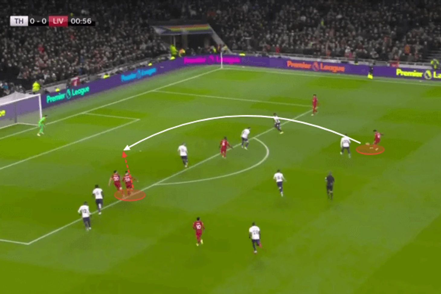 Но тот факт, что Робертсон и Александер-Арнолд продвигались вперед, означал, что при потере мяча, если Шпоры быстро продвигали мяч вперед, они могли бы извлечь выгоду из высокой позиции Харри Кейна и Сон Хын Мина и выбегать два в два. У Жоэля Матипа и Ибраима Конате были проблемы с тем, чтобы справляться с пространством в коридорах.