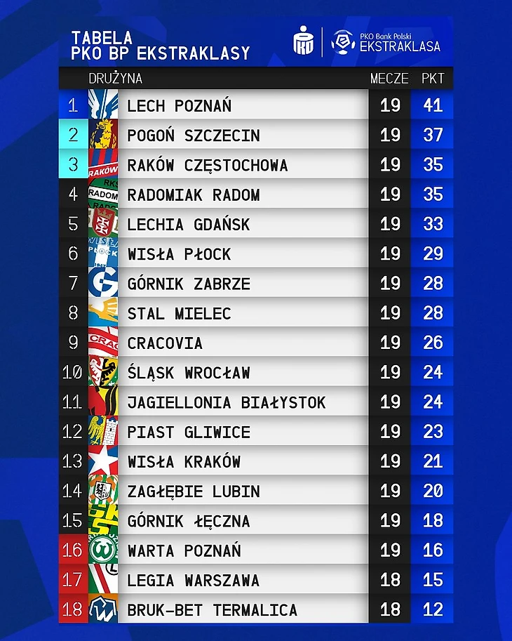 В выходные матчами 19-го тура закончилась первая часть сезона Экстракласы. Команды ушли на зимнюю паузу, которая продлится чуть больше месяца. Этой паузе явно не рады в Ленчне и Радоме, где местные команды в последних матчах набрали великолепную форму, одерживая победу за победой. В то же время дождались паузы в Варшаве, у Александра Вуковича есть чуть больше месяца, чтобы привести «Легию» в порядок и спокойно доиграть уже проваленный сезон.