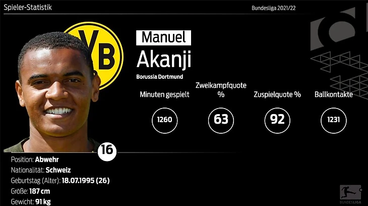 Швейцарец показал самую стабильную игру среди всех полевых игроков за всю первую половину сезона. Несмотря на скомканную подготовку, Аканджи продолжил играть на самом высоком уровне, как он играл за сборную Швейцарии во время чемпионата Европы. И все больше и больше превращается в секретного шефа обороны. 26-летний футболист все чаще берет на себя ведущую роль, руководит четверкой защитников, регулирует игру партнеров впереди и теперь все чаще, чем Матс Хуммельс, начинает атаки длинным пасом, когда ситуация требует обострения игры.