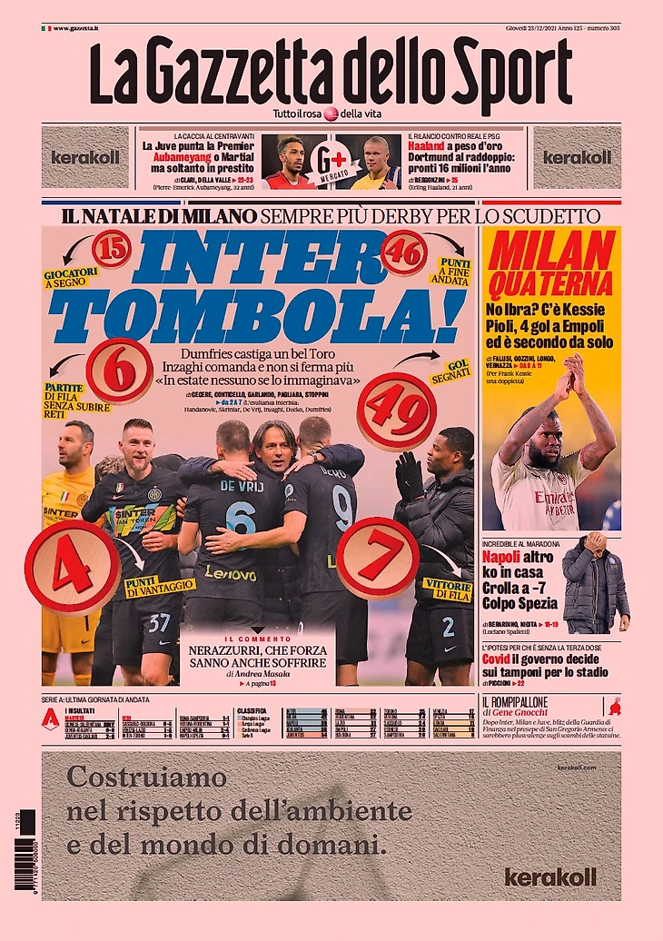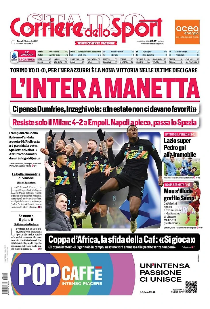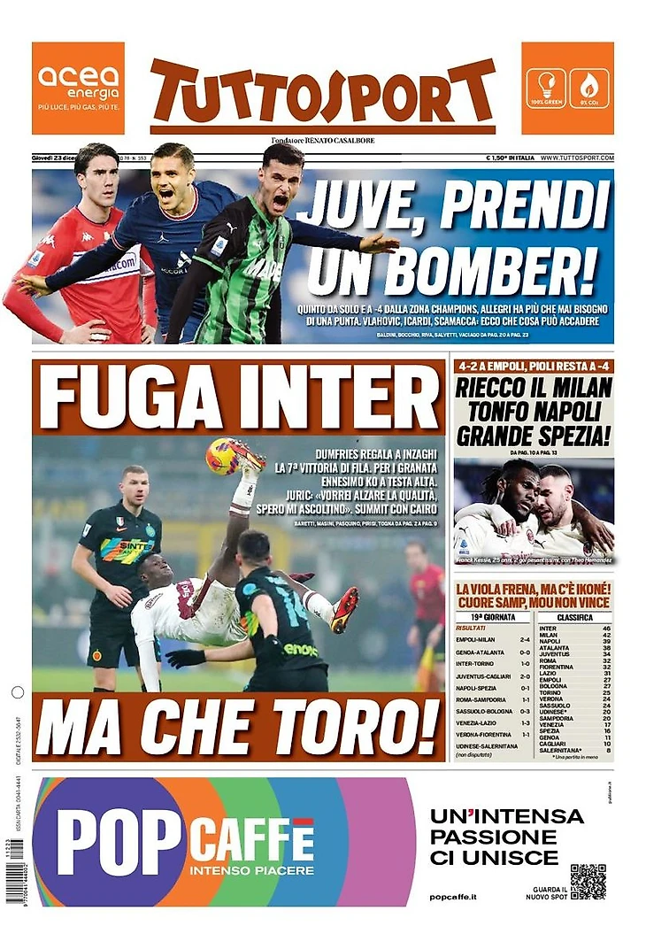 «Бинго «Интера»!» (Gazzetta), «Интер» на полном газу» (Corriere) – такие главные заголовки в всех изданиях. «Торино» проиграл (1:0), у Нерадзурри девятая победа в последних десяти играх. Об этом позаботился Думфрис, Индзаги летит: «Летом никто не ставил нас фаворитами» – Corriere. Gazzetta приводит другую версию цитаты тренера: «Летом никто этого и представить не мог».