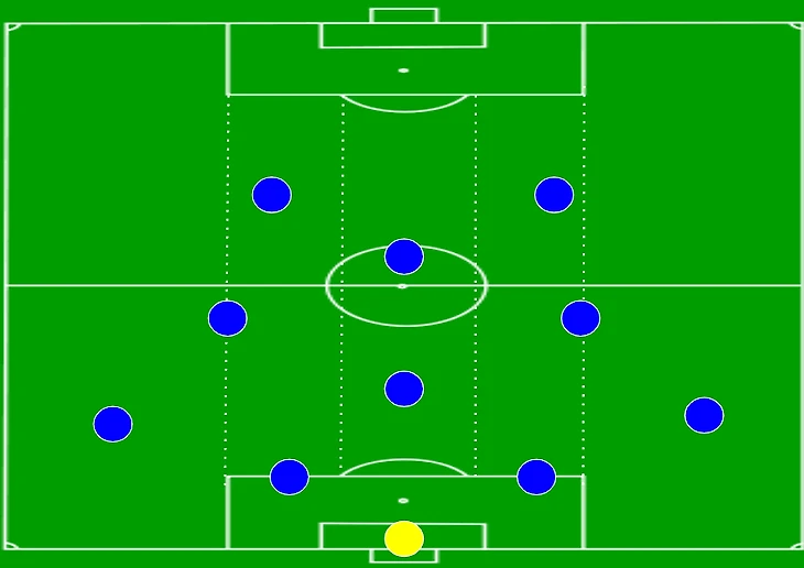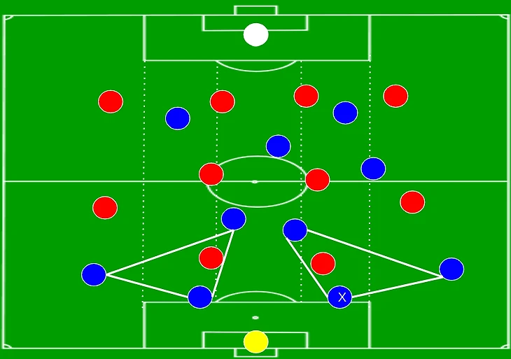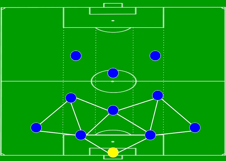 Другой, намного менее традиционный метод создания тройки сзади, изображен на рисунке ниже. Некоторые прогрессивные тренеры используют подключение голкипера в зону между уходящими шире центральными защитниками и таким образом создают 3v2 при одновременном расположении опорника во второй линии. Этот вариант позволяет команде занимать больше горизонтальных линий из-за высоких позиций полузащитников и, как и при прошлой формации, обеспечивает эффективные взаимодействия и позволяет доставлять мяч в различные зоны.