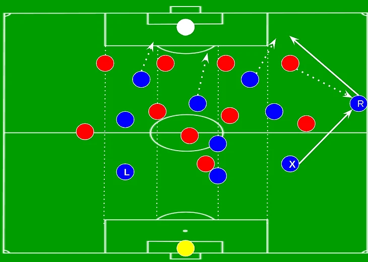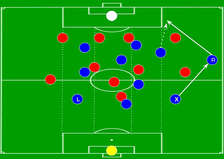 Первый вариант заключается в атаке пространства за спиной крайнего защитника соперника одним из нападающих. Здесь высоко расположен правый крайний защитник, при этом левый крайний защитник располагался бы так же, если бы атака развивалась на его фланге. Когда правый крайний защитник принимает мяч и оппонент выдвигается на него, нападающий совершает рывок за спину крайнему защитнику соперника и получает диагональную передачу в районе линии штрафной. У него в свою очередь появляются опции низкого кросса или передачи назад, во второй темп.