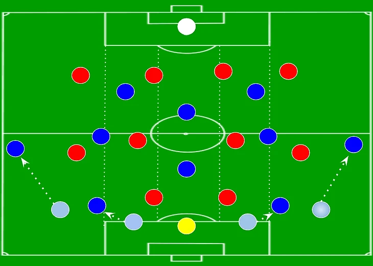 Если же мы все-таки хотим оставить голкипера ниже, но при этом поднять опорника и создать тройку сзади, можно опустить одного из центральных полузащитников, но не между центральными защитниками, а рядом с ними. При билд-апе против системы 4-4-2 такое перемещение будет обеспечивать преимущество 3v1 против вингера соперника. Если ближний к мячу центральный полузащитник команды красных будет играть по опустившемуся полузащитнику синих, откроется линия обостряющей передачи на атакующего полузащитника или одного из нападающих.