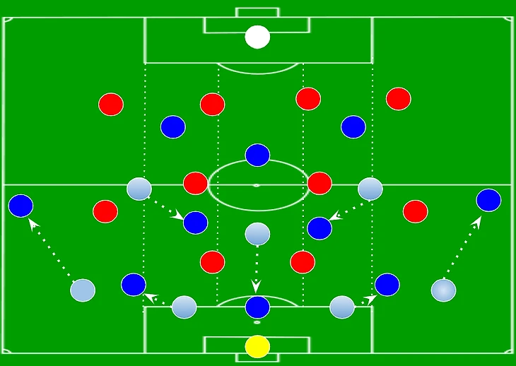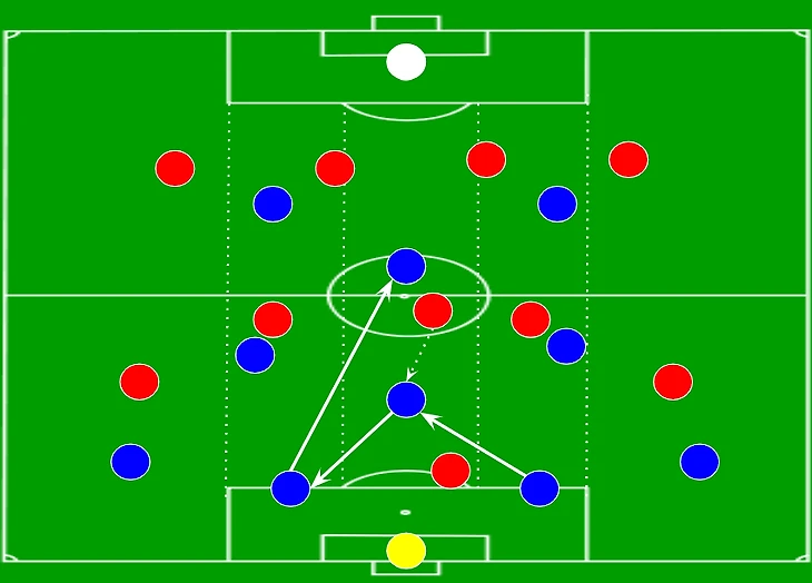 Также при этом движении образуются два треугольника и возникает преимущество 3v1 с каждой стороны. Когда правый центральный полузащитник и атакующий полузащитник занимают зоны между линиями, полузащитники соперника вынуждены либо подниматься для поддержки прессинга, открывая зоны у себя за спиной, либо оставлять нашим игрокам время и пространство в центре. Таким образом атакующая команда опять получает преимущество в центре.