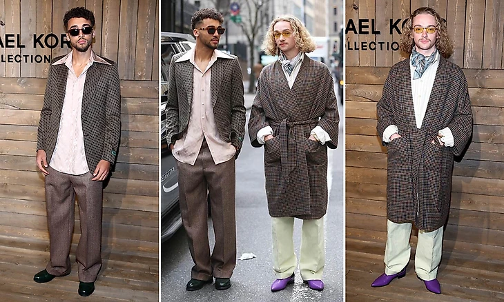 Парни выбрали себе странные образы. Доминик надел широкие брюки, массивные туфли с круглыми носками, рубашку на выпуск, пиджак и очки. За это в соцсетях его сравнивали с детективом из сериала 80-х. Дэвис был в халате и сиреневых остроносых туфлях. Ребята в таком виде прогулялись по Нью-Йорку, а потом пошли на показ Michael Kors.