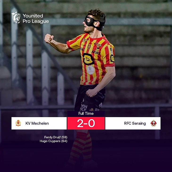 Новичок чемпионата Бельгии потерпел пятое подряд поражение в лиге, но матч мог сложиться совсем иначе. Гости здорово провели первый тайм и заставили вратаря «Мехелена» Куке попотеть: до перерыва он сделал четыре важных сейва. «Первый тайм сложился для нас неудачно, – говорит нападающий «Мехелена» Кейперс. – Думаю, нам потребовалось некоторое время, чтобы снова привыкнуть к футболу без зрителей на стадионе». А вот во втором тайме хозяева переломили игру в свою пользу и забили дважды за восемь минут. В концовке «Серен» сперва чуть не пропустил, но Дитш не позволил Кейперсу оформить дубль, а сразу после этого чуть не сократил отставание: Мариус пробил в перекладину. «Мехелен» благодаря победе поднялся на шестую строчку, а «Серен» остается в зоне стыковых матчей и в этом туре еще сильней отстал от «Зюлте-Варегема». Но еще раз: если бы не фантастическая реакция Куке, провальная серия валлонцев прервалась бы в этом туре.