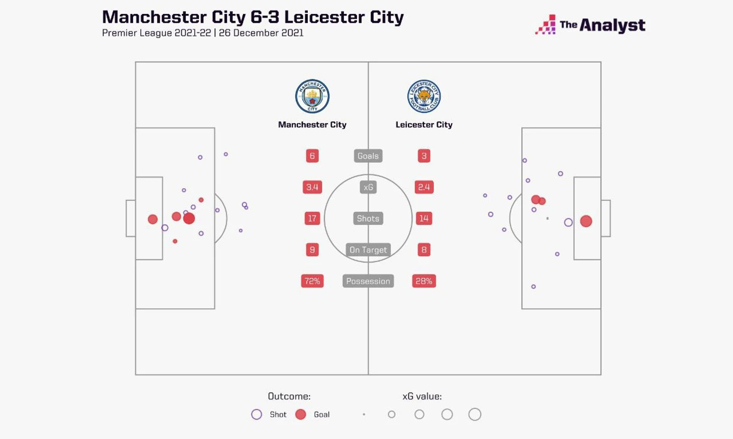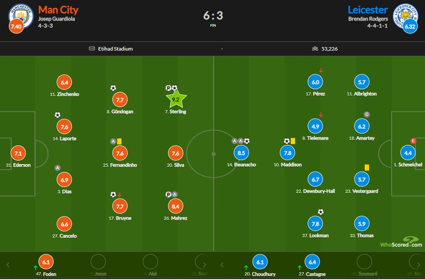 Второй момент, который отличает этот матч от всех предыдущих между Роджерсом и Пепом - прагматизм Гвардиолы в этом сезоне: рулевой Сити прекрасно знает, что от Лисов в их хороший день может влететь и 5, поэтому лезть на рожон с открытым забралом себе дороже. Горожане явно не ставили самоцелью тотальную доминацию, хладнокровно реализуя то количество моментов, которое возникало. При счете 4:0 Сити 4 раза пробили по воротам, а все удары угодили в створ и закончились забитыми мячами. Правда, на последних минутах Сити могли забить еще раз: Стерлинг замыкал передачу Зинченко, но гений Шмейхеля решил судьбу момента.