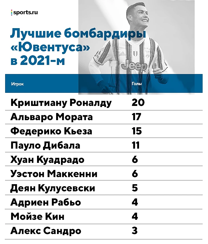 • «Юве» без Криша идет пятым в Серии А с отставанием от лидирующего «Интера» в 12 очков. А что насчет преследователей в бомбардирской гонке? Мората в 2021-м забил 17 голов, Кьеза – 15, а Дибала – 11. Но Роналду провел в клубе на четыре месяца меньше остальных.