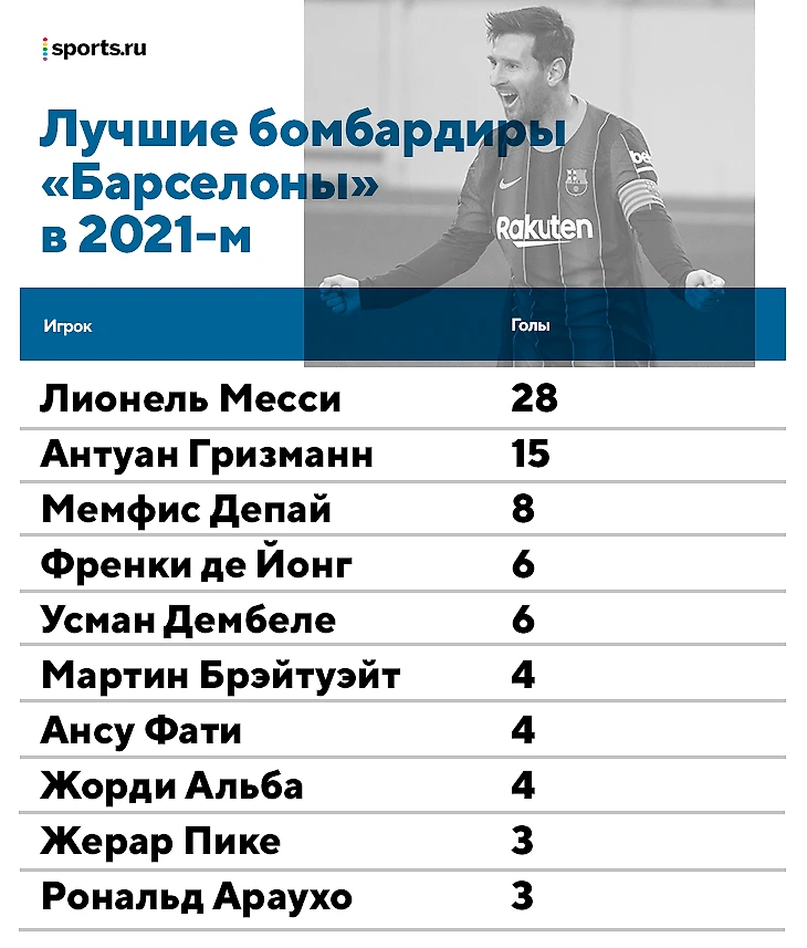 • В «Барсе» же все настолько плохо, что вторым бомбардиром команды в 2021-м стал Анутан Гризманн (15 голов), который тоже ушел летом и не забивал за команду с мая. Если не учитывать Гризманна, то чтобы обойти Месси, придется объединить показатели пяти следующих бомбардиров клуба. Депай (8), Де Йонг (7), Дембеле (6), Брэйтуэйт и Ансу Фати (у обоих по 4) в сумме забили 29 голов.