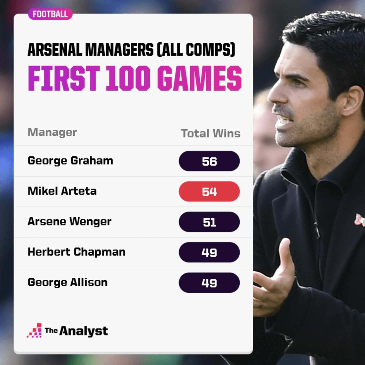 В ноябре против "Уотфорда" Артета стал 15-м тренером, который провел 100 матчей за "Арсенал", и только Джордж Грэм (56) может похвастаться лучшим показателем побед, чем испанец (54) после 100 игр за клуб.
