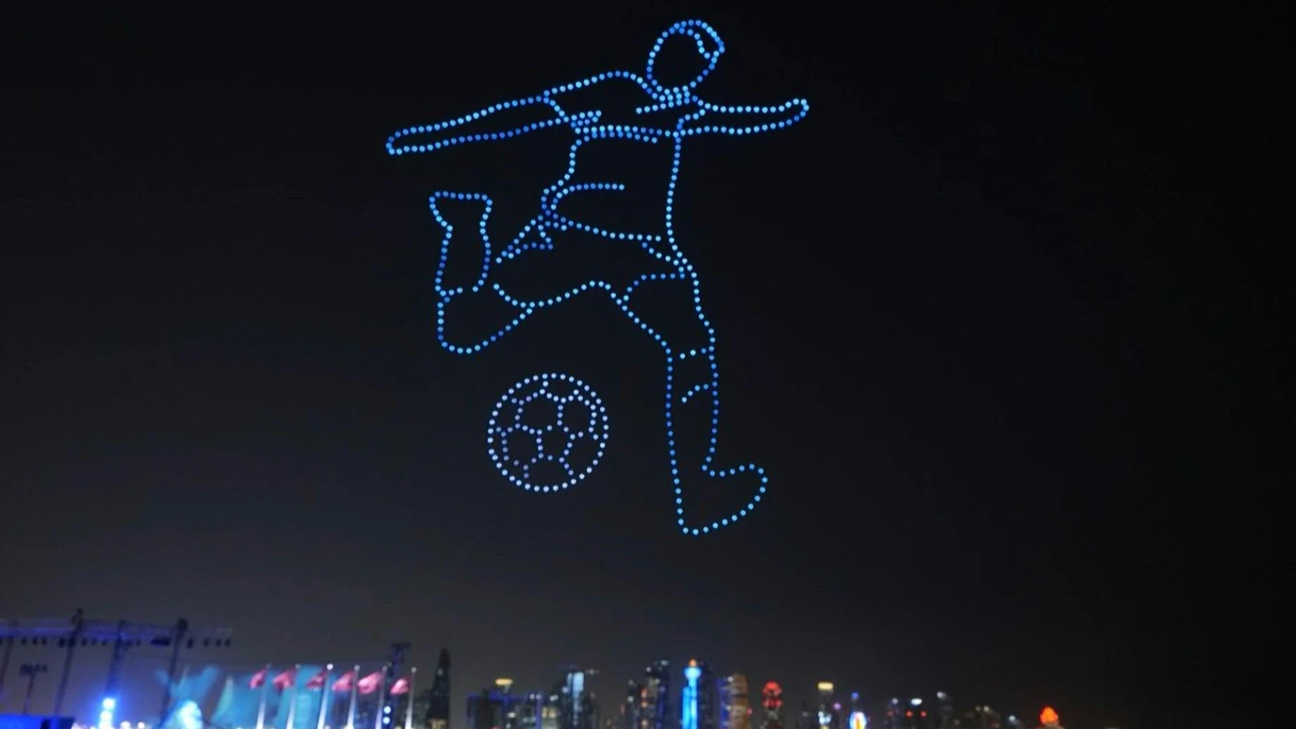 500 дронов, Доха. В следующем году Катар примет Чемпионат мира по футболу. За год до начала соревнований организаторы устроили шоу: в небе над Дохой застыл созданный из дронов многометровый футболист, готовый забить гол в ворота. Среди фигур были также трехмерное изображение планеты, плавно перешедшее в изображение мяча, а также надпись 365 days to go — вот что значит привлечь внимание к событию, которое состоится через год.