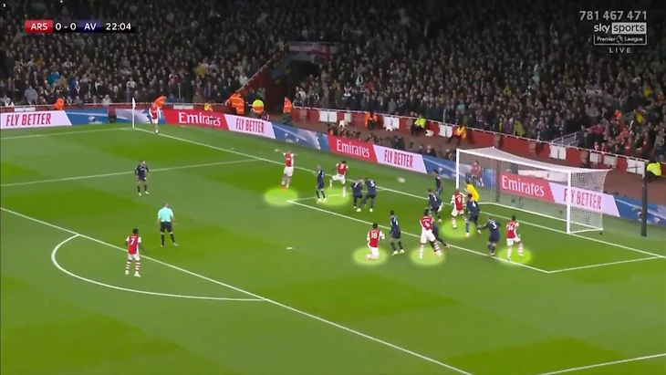 Томас, автор гола, и Бенджамин Уайт набегали на угол вратарской, Томиясу и Габриэл, главная ударная сила на втором этаже, открывались в зоне 11-метровой отметки, а Ляказетт и Обамеянг – внутри вратарской площадки. Подобное расположение усложняет обороняющейся команде понимание того, куда будет послан мяч, а парность игроков в различных зонах кратно увеличивает шансы как минимум на удар по воротам.