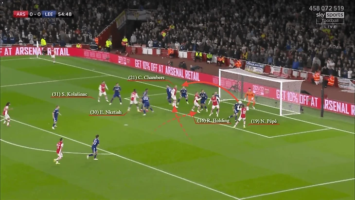 Среди возможных адресатов передачи Смит Роу на углу вратарской сразу двое – Колашинац и Нкетиа. В эту же зону из глубины пересекающимися курсами выдвигаются Холдинг и Чемберс.