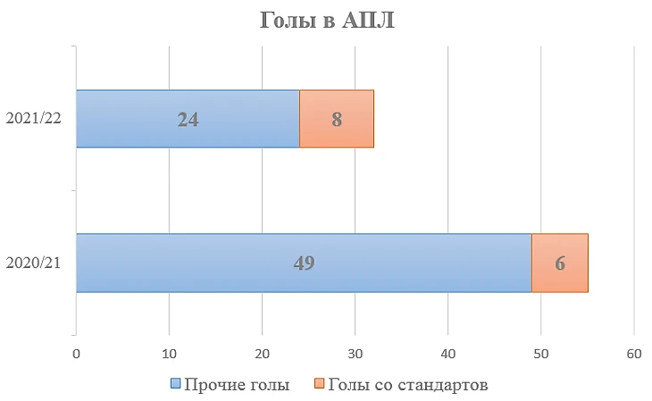 На гистограмме отображены доли «стандартных» голов «Арсенала» в АПЛ в прошлом и текущем сезонах. Глобальный вывод – команда стала забивать больше со стандартных положений в сравнении с предыдущим сезоном. За половину этого сезона «Арсенал» забил больше, чем за весь прошлый (8 против 6).