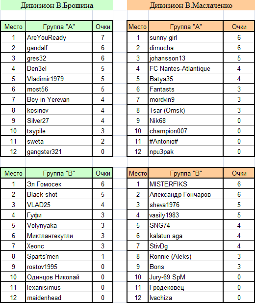 Турнирное положение в Группах и Дивизионах после сыгранного тура: