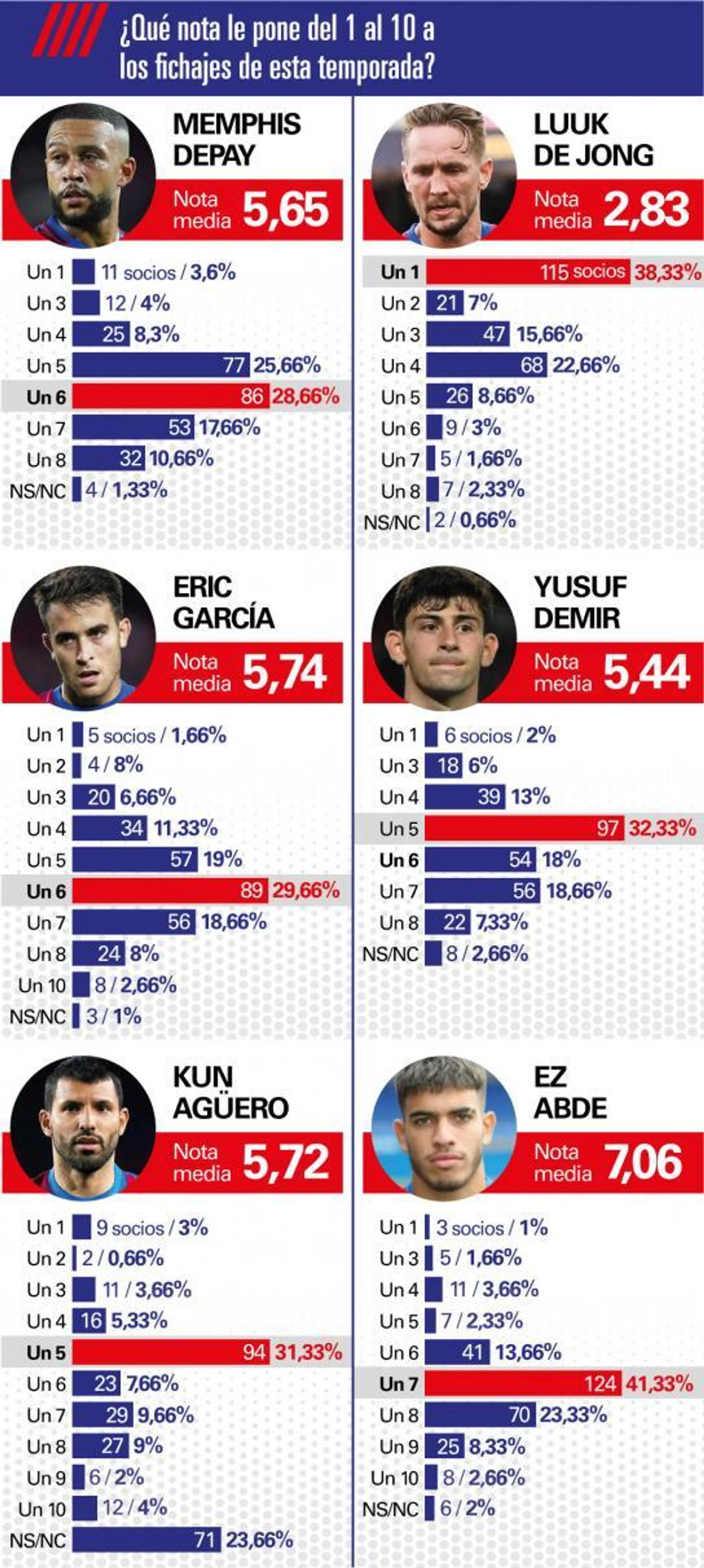 Главный провал – Люк де Йонг со средним баллом 2,83/10, а наиболее частая оценка для него – это единица.