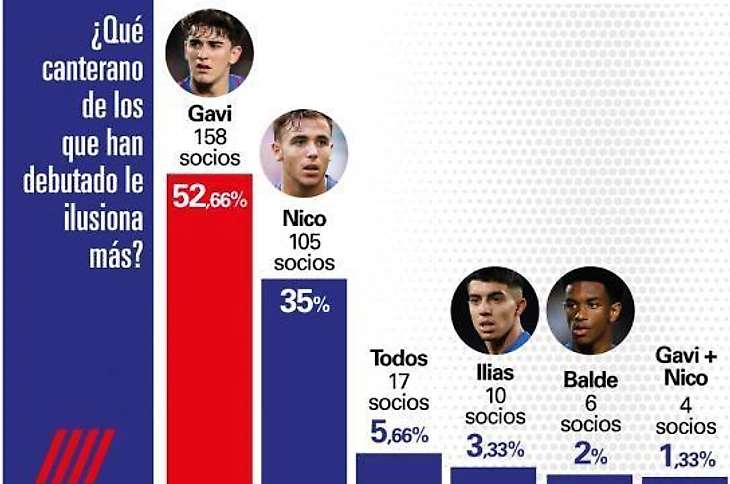 Ла Масия продолжает вызывать энтузиазм у болельщиков. Гави понравился более половине опрошенных (52,66%), за ним следует Нико Гонсалес с 35%. Ахомач получил 3,33% голосов, а Бальде – 2%.