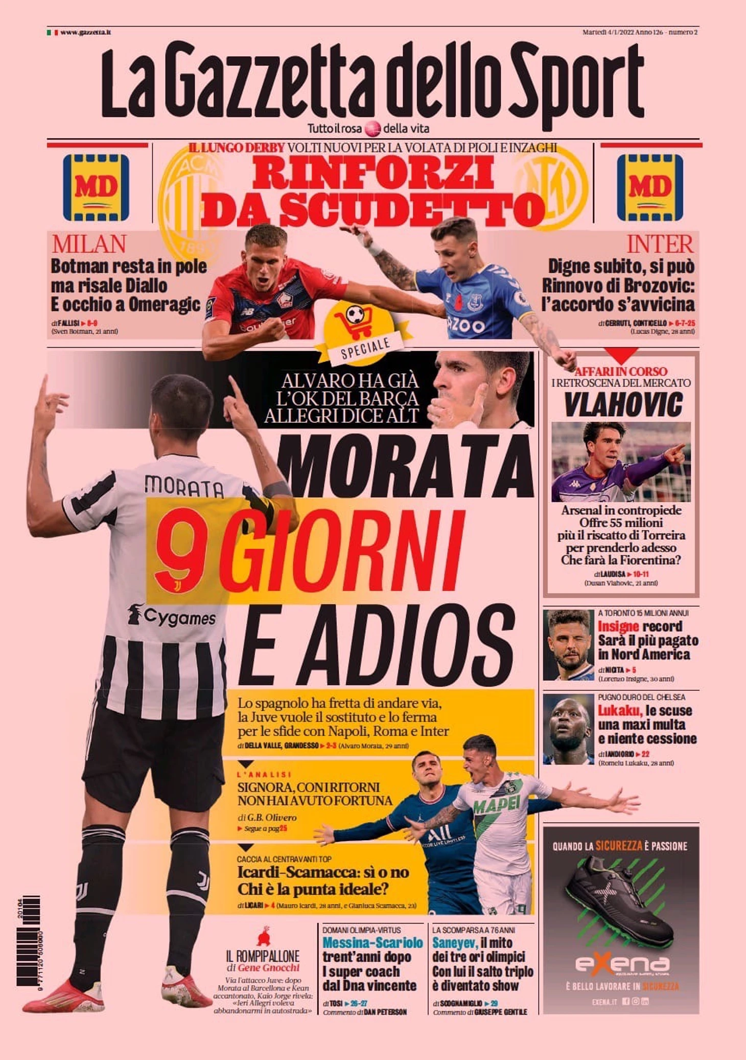 Мората, 9 дней и прощание. Заголовки Gazzetta, TuttoSport и Corriere за 4 января