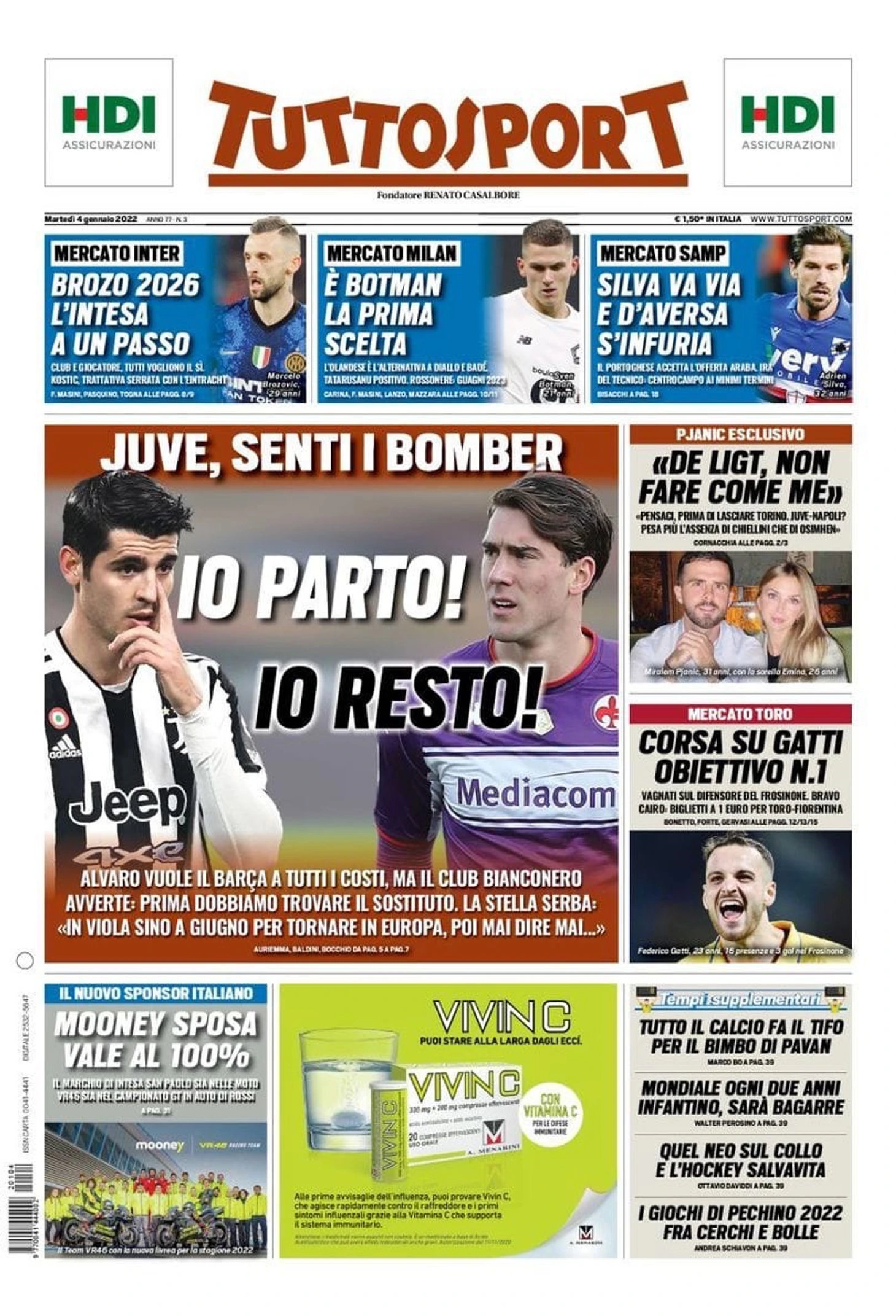 «Юве», послушай бомбардиров: «Я ухожу!», «Я остаюсь!» – пишет TuttoSport о Морате и Влаховиче. «Альваро хочет в «Барсу» любой ценой, но клуб Бьянконери предупреждает: сперва мы должны найти замену. Сербская звезда: «В составе «фиалок» до июня, чтобы вернуться в Европу, а потом никогда не говори «никогда»…».