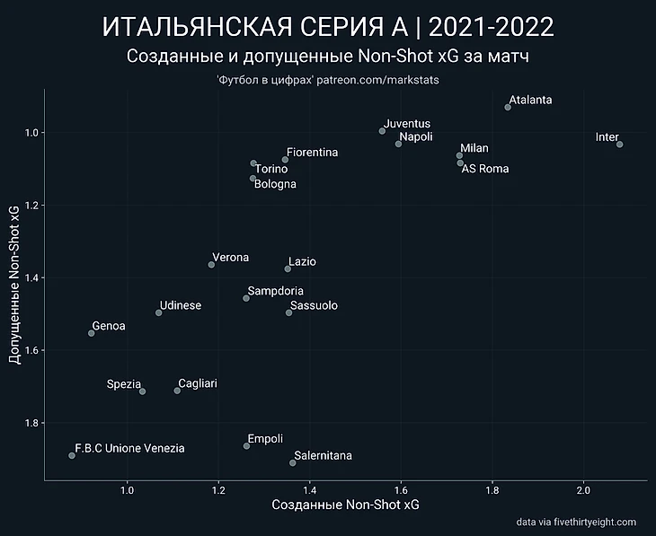 Этот показатель объясняет нам особенность игры Атланты, за счет контроля мяча создают опасности в лиге больше всех, кроме лидера, а допускают ее даже меньше, чем Интер. Рома удивляет и в этом показателе и делит 3 место по Non-Shot xG с Миланом, которой по этой статистике выглядит предпочтительнее Юве и плюс-минус одинаково с Наполи. Фиорентина выглядит существенно лучше Лацио, имея одинаковые показатели в атаке, фиалки лучше в обороне. Бросается в глаза высокое положение Болоньи, и крайне низкое Эмполи.