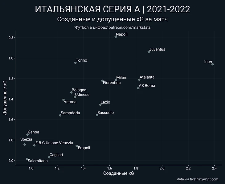 На графике мы видим, что Интер не просто так лидирует в чемпионате, имея лучший показатель созданных xG моментов и третий по допущенным. Ювентус идет второй по обоим показателям, хотя в таблице всего лишь пятый. Наполи имеет лучшую оборону не только по показателям пропущенных голов, но и по допущенным моментам. Бросается в глаза, что Рома создает на одном уровне с Аталантой Гасперини и делит третье место, хотя мы привыкли видеть другой футбол от команд Жозе Моуриньо. Милан пятый по обоим показателям несмотря на второе место в таблице. Торино хорош по действиям в обороне, а вот Фиорентина не выглядит так уж мощно по показателям xG, несмотря на место в таблице. Лацио и вовсе выглядит середнячком по этим показателям, несмотря на то, что временами показывал очень содержательную игру. Абсолютным аутсайдером, как и по таблице, выглядит Салернитана.