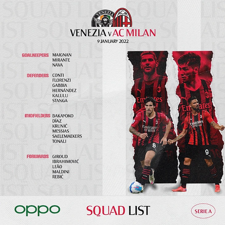 Заявка "Милана" на матч 21 тура против "Венеции" (16 место):