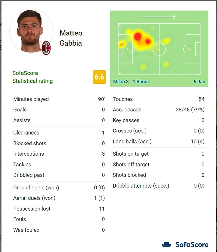 1 выйгранная верховая дуэль, 3 перехвата, 79% точность передач, 1 раз Матео успешно подчистил за партнером.