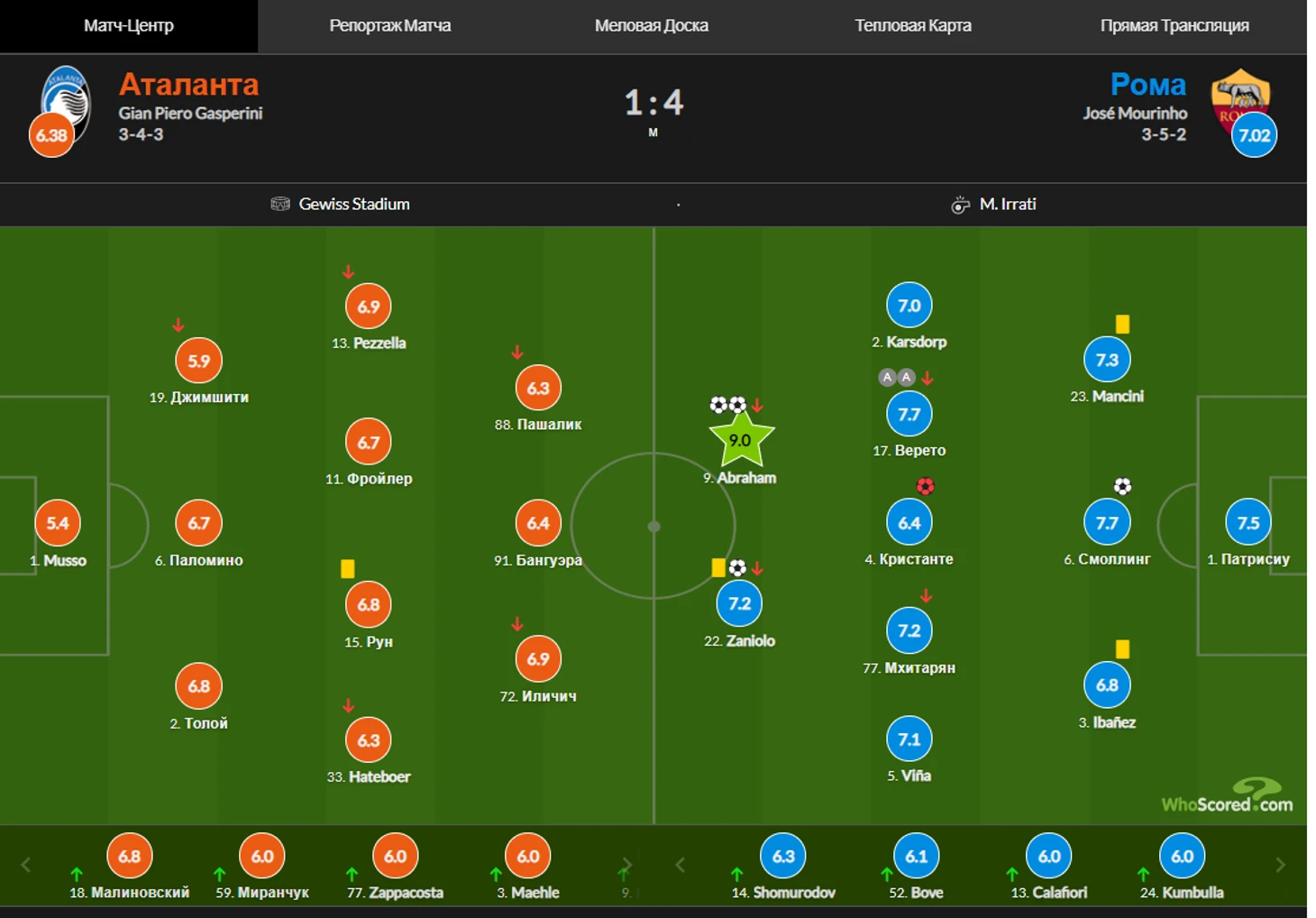На 76 минуте авторов голов оба тренера решили сменить. Жиру уступил место, прям как в автобусе, Ибрагимовичу, а вместо Абрахама вышел Шомуродов. Лебединую песню Пиоли дал исполнить Конти,который заменил Флоренци.