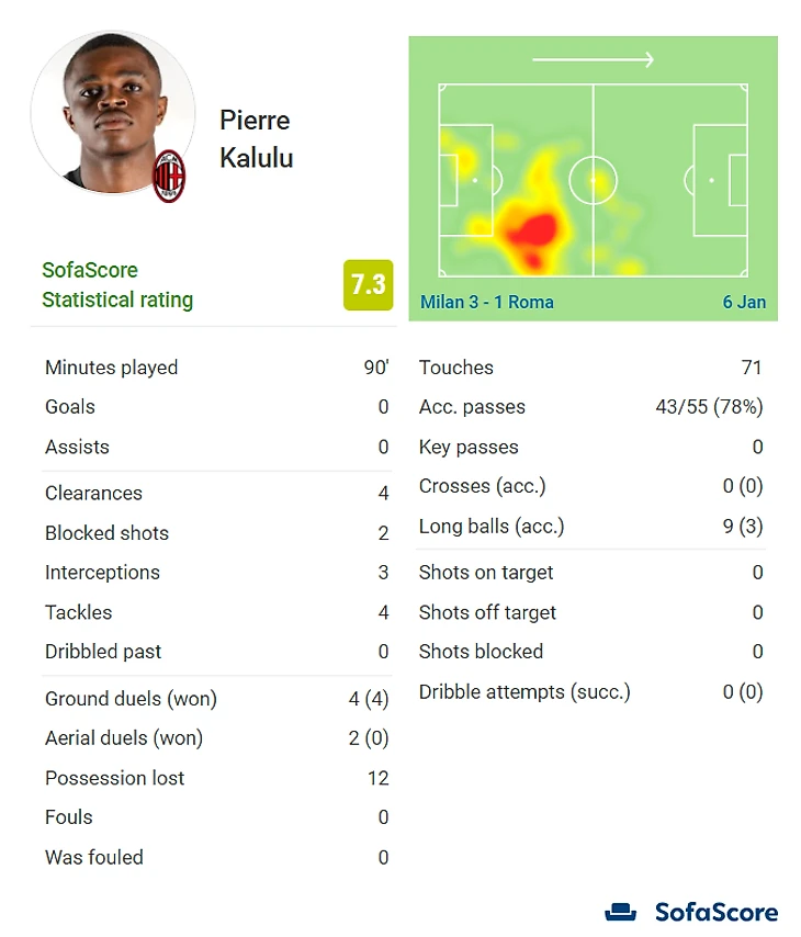 2 блока, 3 перехвата, 4 отбора, 4 из 6 выйгранных дуэли, 78% точность пасов. Калулу действительно был хорош.
