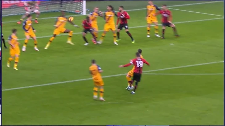 59 минута встречи, и снова майк победил в схватке с Абрахамом. Англичанин развернувшись в противоборстве с калулу, пробил в правый от Меньяна угол, но кипер Милана был на страже.