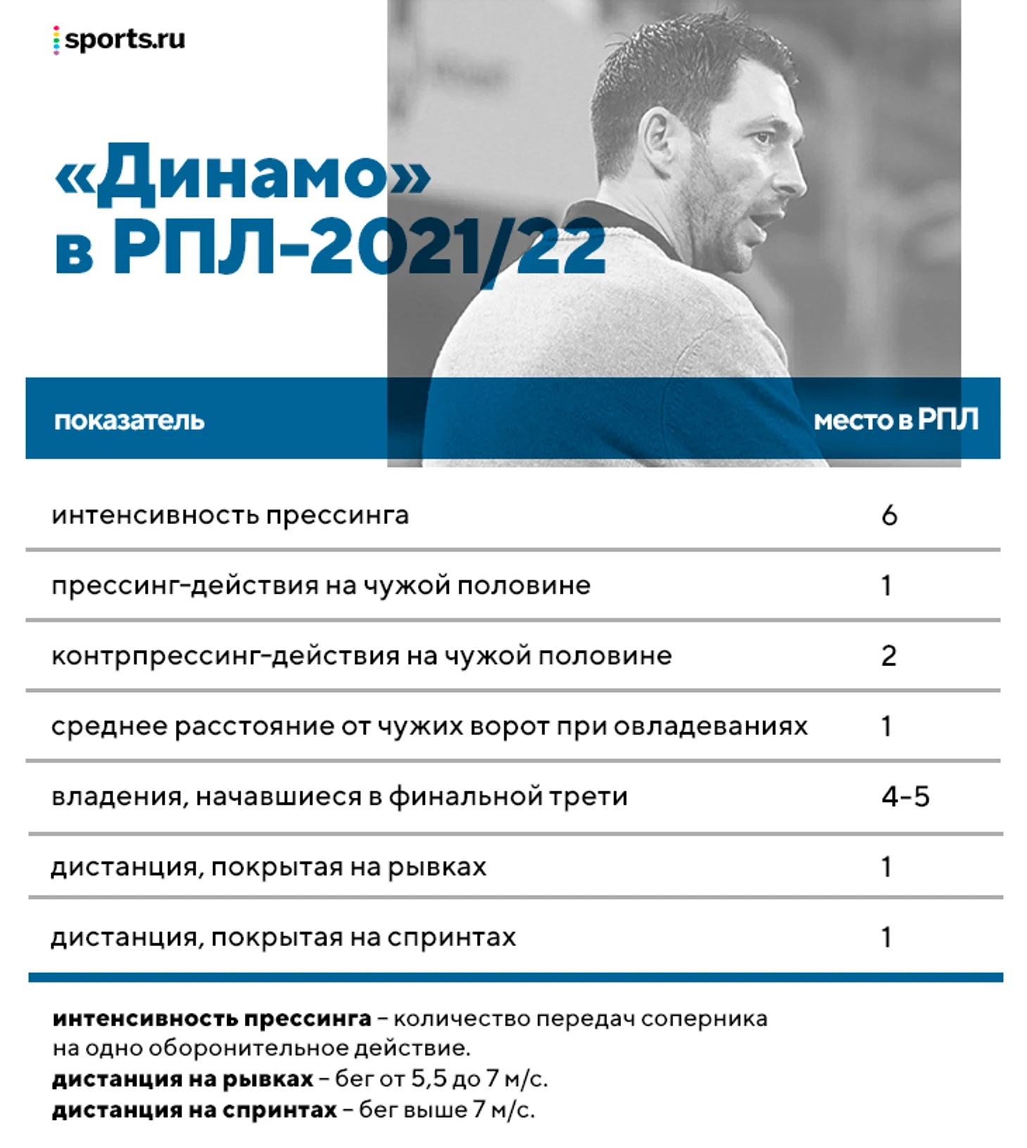 В начале декабря Сандро Шварц детально объяснял принципы прессинга «Динамо» в «Тотальном футболе»: «Захарян, Грулев и Макаров (в рассматриваемой игре именно они составляли атакующую тройку – Sports.ru) первыми начинают прессинг, когда защитник соперника не очень хорошо принял мяч. Инициирует прессинг тот, кто находится ближе всего к сопернику. Если соперник после этого делает длинную передачу, подключается вторая линия прессинга. Мы уже в этот момент расположены так, чтобы сделать подбор. Нет смысла, если сигнал к началу прессинга подает защитник или опорник, это должен делать тот, кто находится ближе всего к мячу».