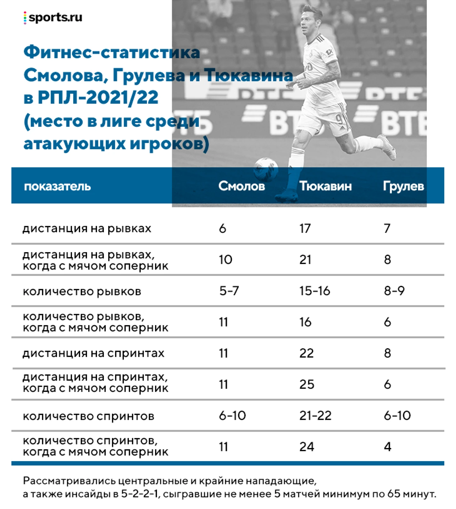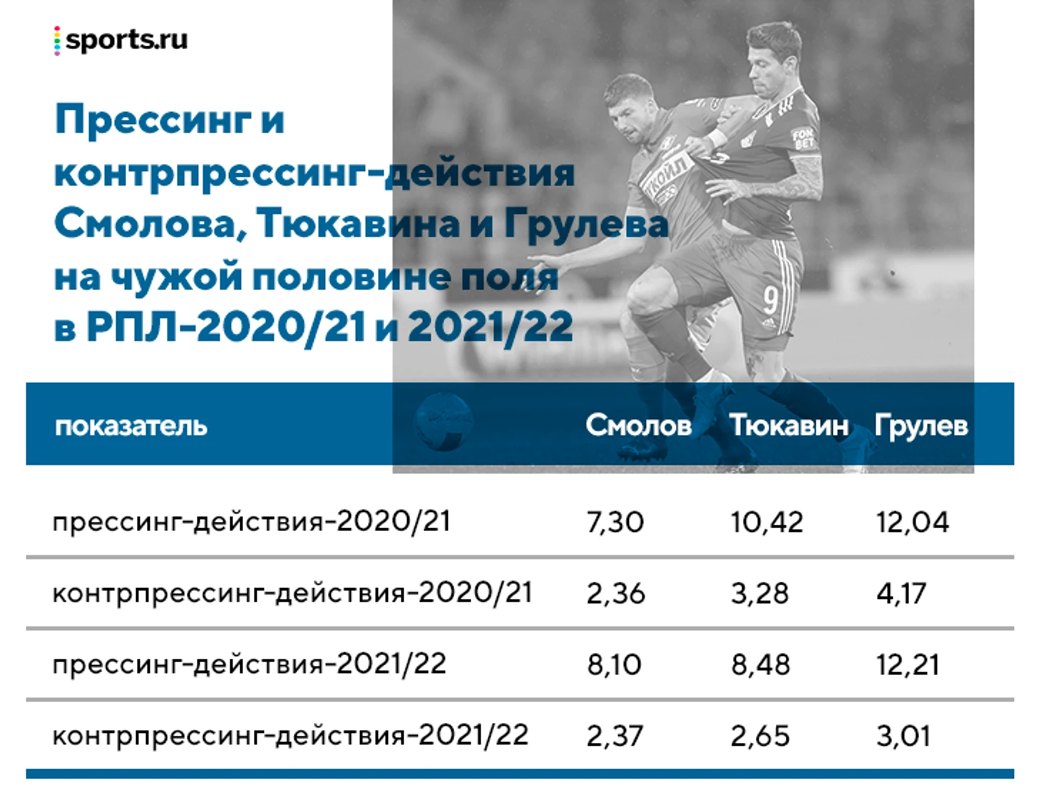 Очевидно, Грулев гораздо лучше Тюкавина адаптирован к постоянной интенсивной работе, когда мяч находится у соперника. Например, в прошлом сезоне на отрезке после прихода Шварца (18 туров) Грулев был лидером среди атакующих игроков РПЛ по прессинг и контрпрессинг-действиям на чужой половине. Именно «атакующих игроков», а не центральных нападающих, потому что и год назад Грулев не всегда выходил на острие.