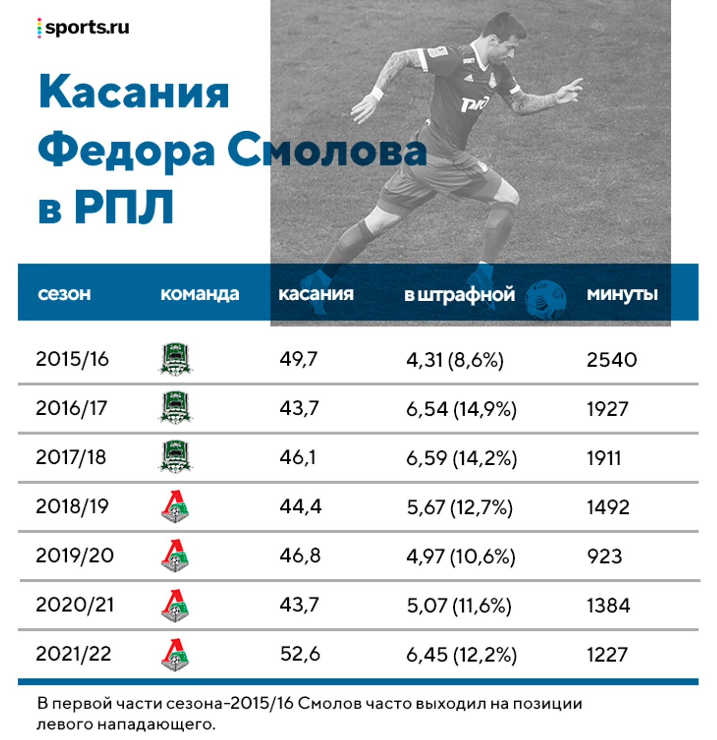 В «Краснодаре»-2016/17 и 2017/18 Смолов более 14% касаний совершал в штрафной, в «Локомотиве» процент тут же упал до 12 (а в первой части сезона-2019/20 до аренды в «Сельту» вообще было 10,6%).