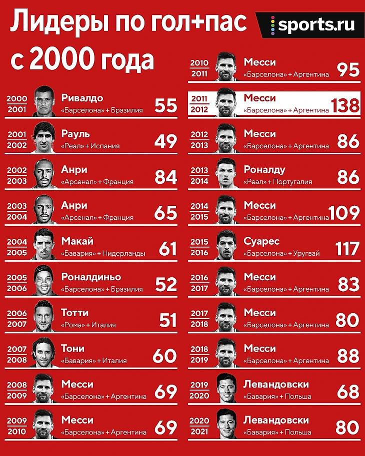Но до Месси и Роналду были другие герои, которые выбивали отличные цифры по системе гол + пас. Мы посчитали, кто был лучшим в каждом сезоне начиная с 2000 года. Учитывались матчи и клубов, и сборных!
