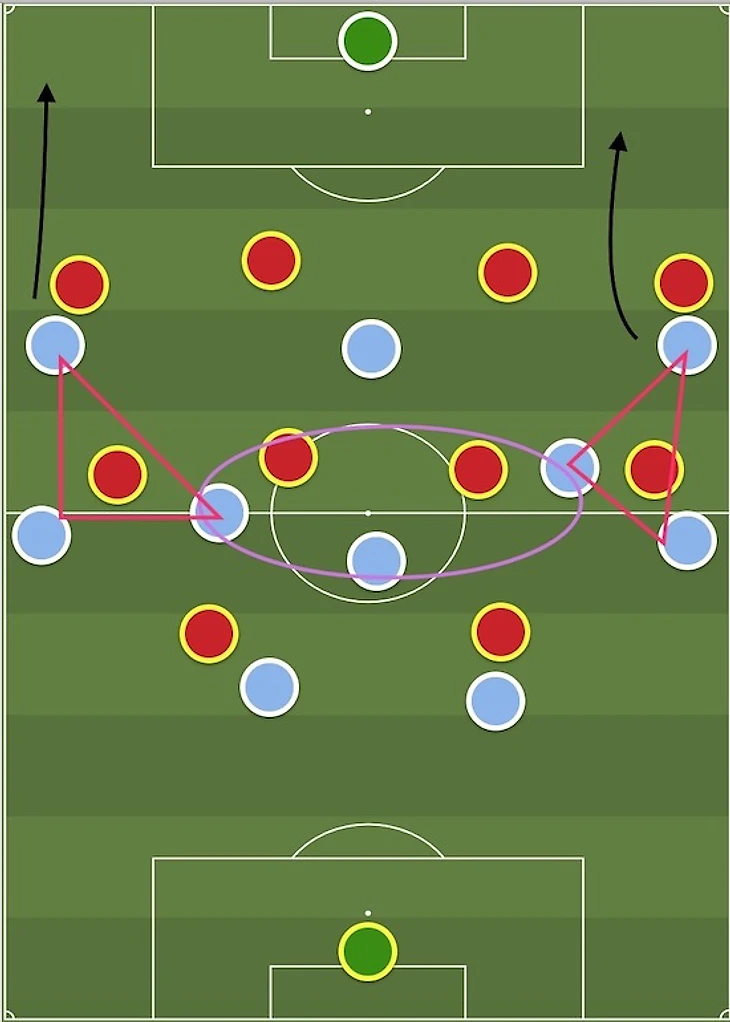 Заставляя соперника принимать поспешные решения и перекрывая ему доступ к более простым вариантам накоротке, неаполитанцы предлагали оппонентам попытать счастье в средних и длинных забросах, что зачастую позволяло вернуть владение. Возвращаясь к теме вовлечения оборонительных блоков противника в собственную атакующую игру, нельзя не выделить тот факт, что это делается заметно проще, когда формация команды с мячом более компактна - плотность позволяет создавать эффективные взаимосвязи между линиями и игроками. Когда латерали поднимаются к линии полузащиты, владение мячом заметно облегчается, к тому же, появляются новые варианты для передач. Это также позволяет сохранить контроль над мячом в центре поля (фиолетовая зона). Когда мяч находится в этой части поля, у соперника возникает ряд вопросов, касающихся выбора: либо им необходимо также увеличивать плотность при помощи выдвижения новых футболистов вперед, либо, наоборот, отойти назад, тем самым создав пространство для владеющих мячом. Второй вариант упростит игру атакующей команды, когда как первый можно будет преодолеть через быстрый короткий пас. Сила "Наполи" как раз и заключалась в том, что у них были способы "демонтировать" чужую оборону в любом из описанных вариантов.