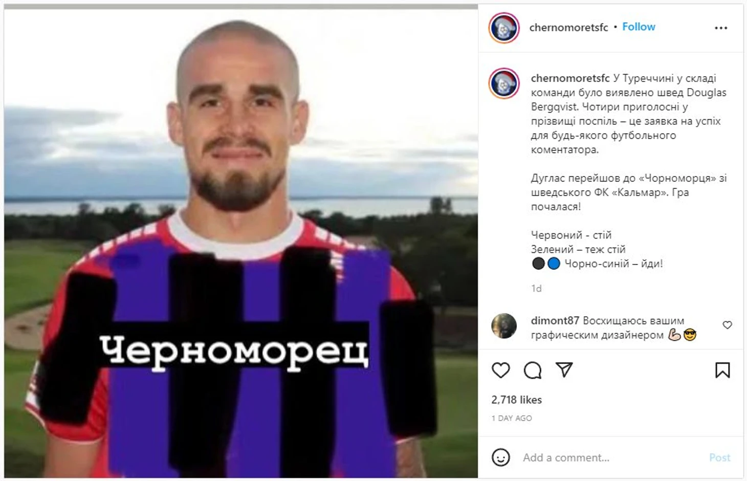 Украинский клуб бесплатно подписал шведского защитника Дугласа Бергквиста из «Кальмара». Для анонса выбрали фотографию, которую при трансфере использовал прошлый клуб – и просто в Paint неаккуратно раскрасили форму в цвета «Черноморца» и написали название новой команды.